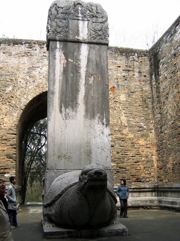 Abbildung der "Ersatzlieferung": Weil's angeblich mit der gigantischen Stele nicht geklappt hat, musste man ausweichen, um im Sifangcheng-Pavillon von Ming Xiaoling dem Hongwu Kaiser seine Ehrerbietung zu zeigen: Die große Bixi-Schildkröte mit der Shendong Shengde Stele zu Ehren des Hongwu Kaisers (>> Bildquelle) ist gegenüber der ursprünglichen Stelenplanung eher eine Miniaturausführung: (Zur Erklärung: Bixi ist einer der neun Söhne des Drachenkönigs. Als Skulptur findet sich das Motiv in Sockeln von Denkmälern und Grabsteinen, aber auch in Brückenpfeilern und Torbögen. Man findet sie im ostasiatischen Raum, darunter Vietnam, Mongolei, Korea, Japan und Teilen Russlands). Die Schildkröte ist 5,15 m lang, 2,54 m breit und 2,8 m hoch, die Stele ist 8,78 m hoch (einschließlich der Schildkröte). Größentechnisch geradezu lächerlich gegenüber der ursprünglichen Idee …