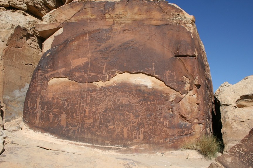 Neben den üblichen Jagdszenen – die weltweit auch bei vielen anderen Petroglyphen zu finden sind – erkennt man einen undurchdringlich wirkenden Bogen, er über Menschen und Tiere gespannt wurde. Es stellt sich mir die Frage, ob es sich hier um die Illustrierung eines profanen Regenbogens handelt oder um das Himmelsfirmament? Was wollten die prähistorischen Künstler damit ausdrücken?