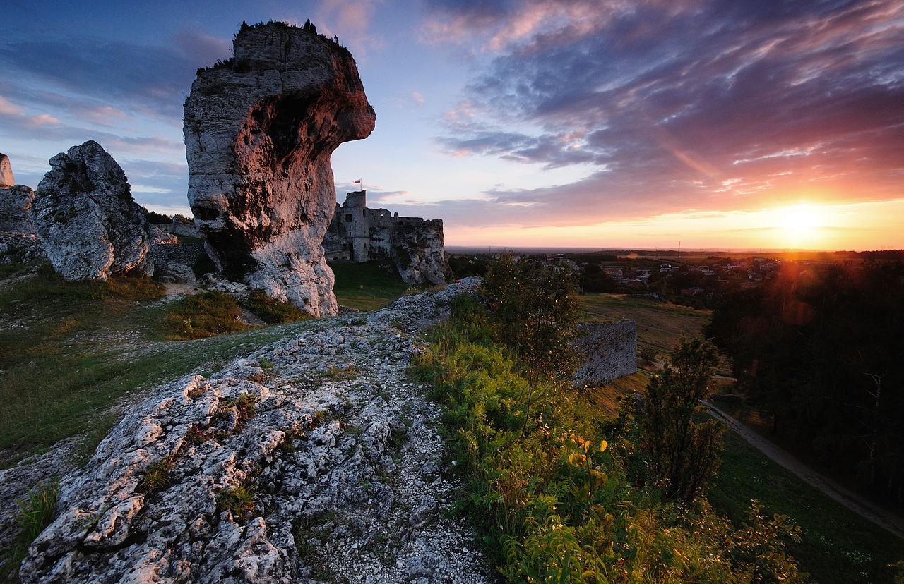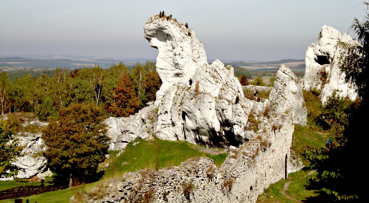 Auf der "Route der Adlerhorste" befindet sich die Burgruine Ogrodzieniec (gehört jedoch nicht zur Stadt) in unmittelbarer Nähe der lokal bekannten Granitfelsen und dem Kalksteingebiet des Oberjura. Die Erwähnung der polnischen Burg geht zurück auf das 13. Jahrhundert, in dem sich bereits die Mongolen am Standort zu schaffen gemacht haben. Sie brannten sie offenbar zum ersten Mal nieder. Über die interessanten Fundamente der Burg, die weitaus markanter sind als die originell gewählte Schräglage der Fotografie von Kamil Porembiński, weiss man indes recht wenig.
