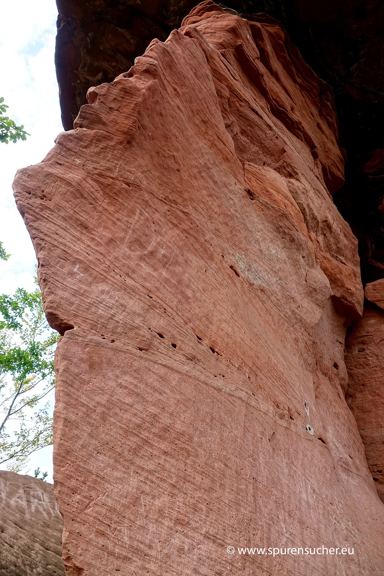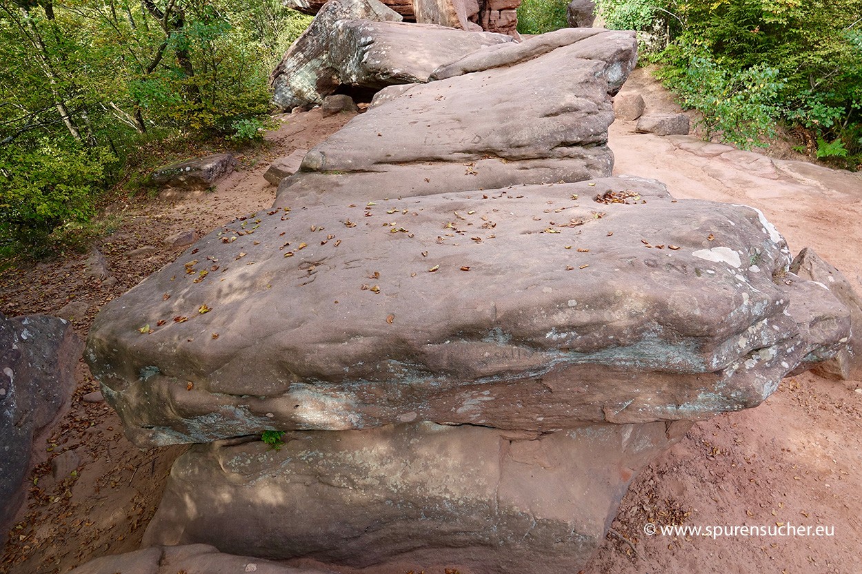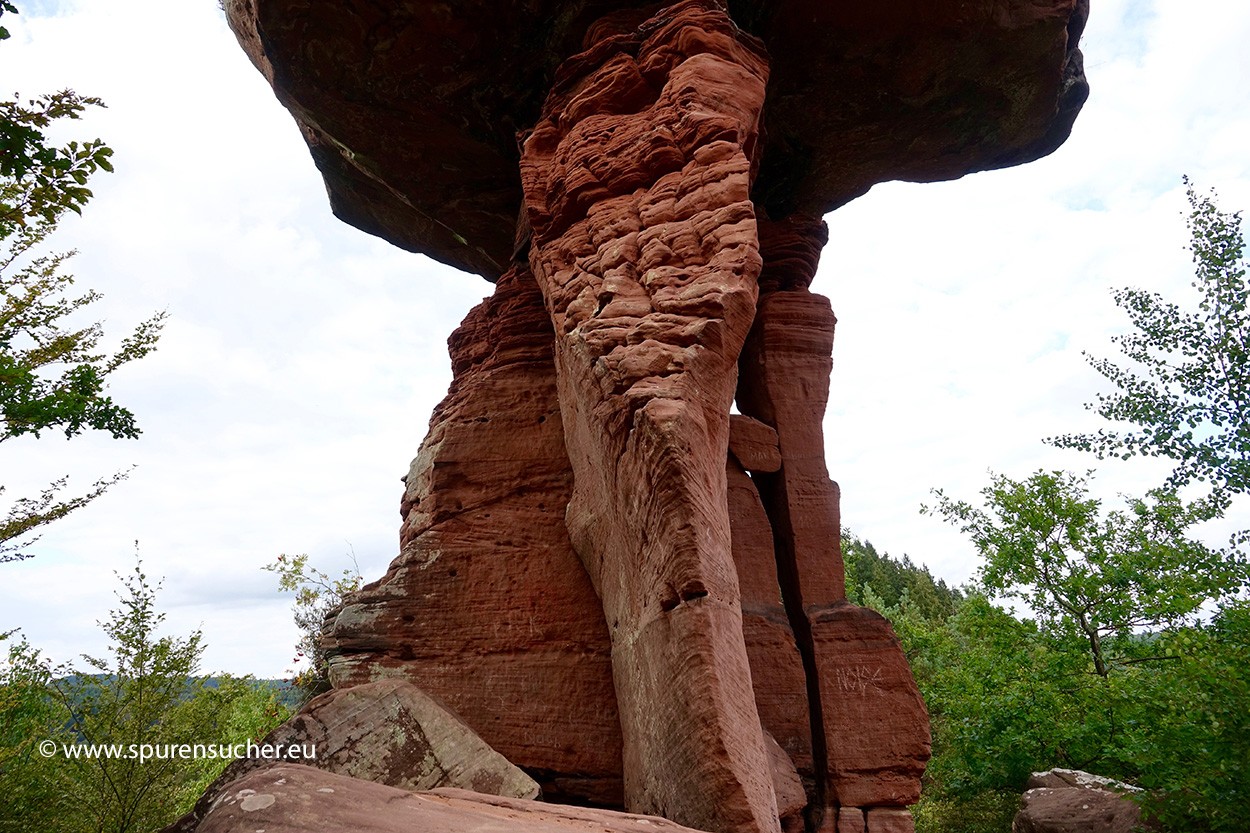 Die Säulenabgänge des Tischs wirken zum Teil stark ausgequollen. Ein Phänomen, das bei den anderen Felsen nicht in dieser Form auftritt. Ein Indiz dafür, dass wir es hier mit doch recht unterschiedlichen Bundsandstein-Varianten zu tun haben. Und tatsächlich räumt man seitens der Wissenschaft ein, dass der Verwitterungsprozess immerhin sehr unterschiedlich ausfällt.