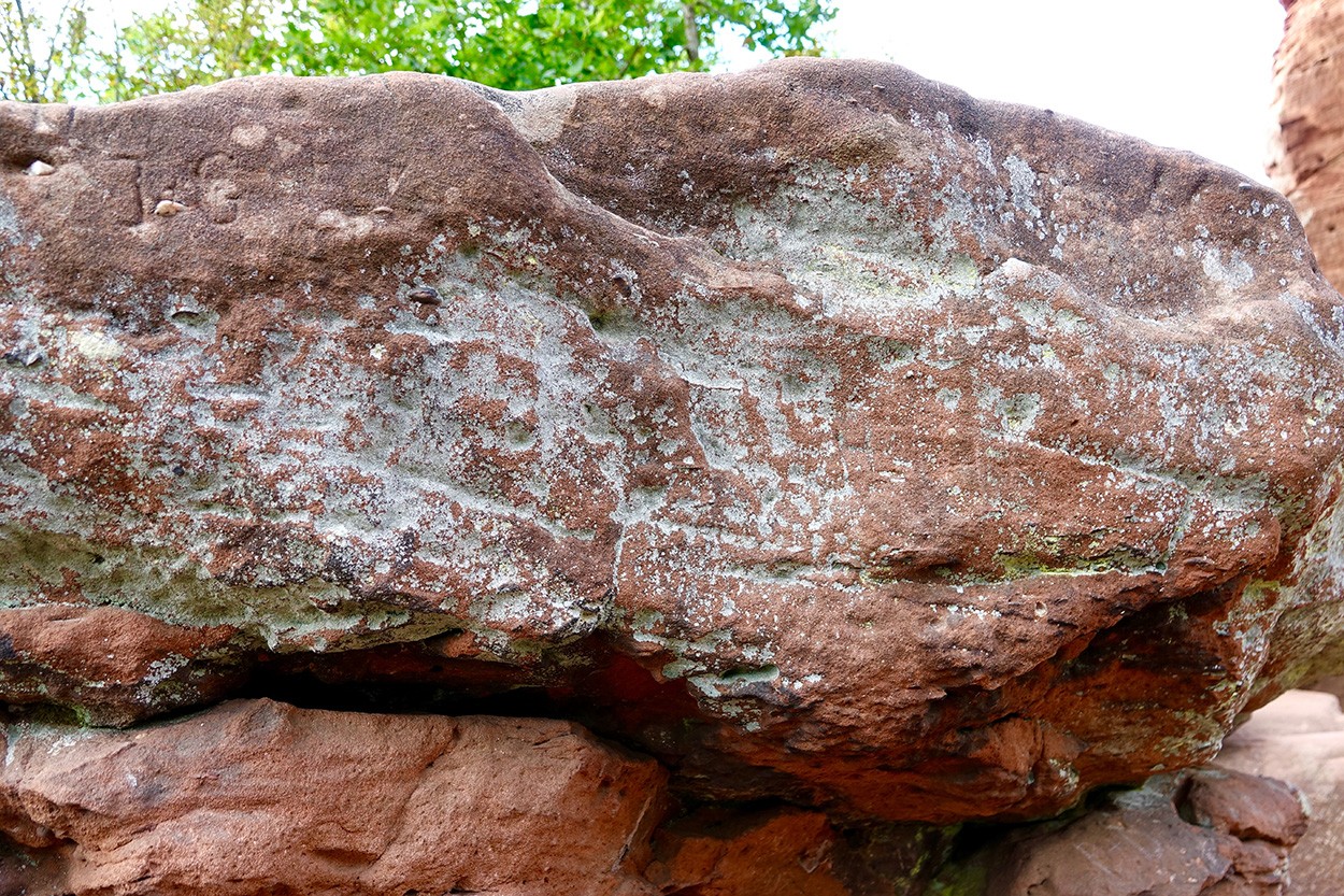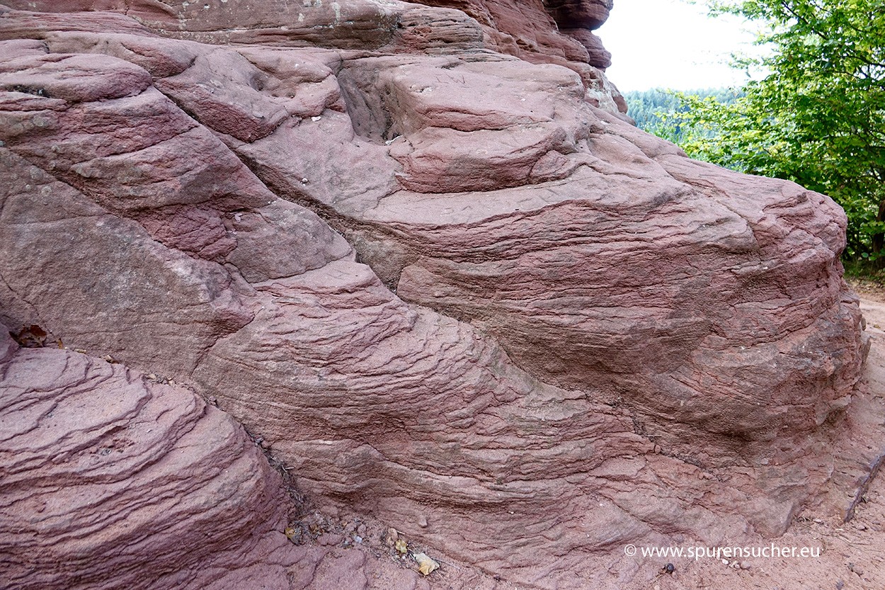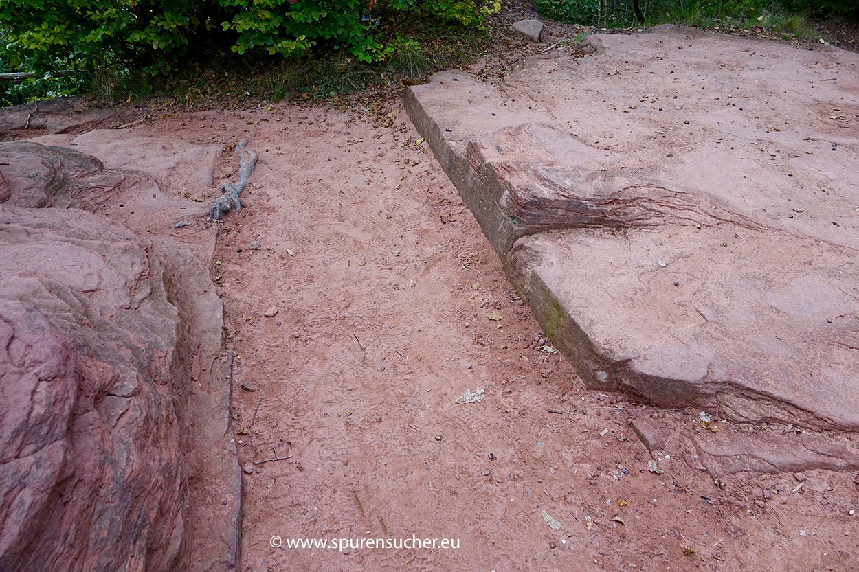 Die Säulenabgänge des Tischs wirken zum Teil stark ausgequollen. Ein Phänomen, das bei den anderen Felsen nicht in dieser Form auftritt. Ein Indiz dafür, dass wir es hier mit doch recht unterschiedlichen Bundsandstein-Varianten zu tun haben. Und tatsächlich räumt man seitens der Wissenschaft ein, dass der Verwitterungsprozess immerhin sehr unterschiedlich ausfällt.