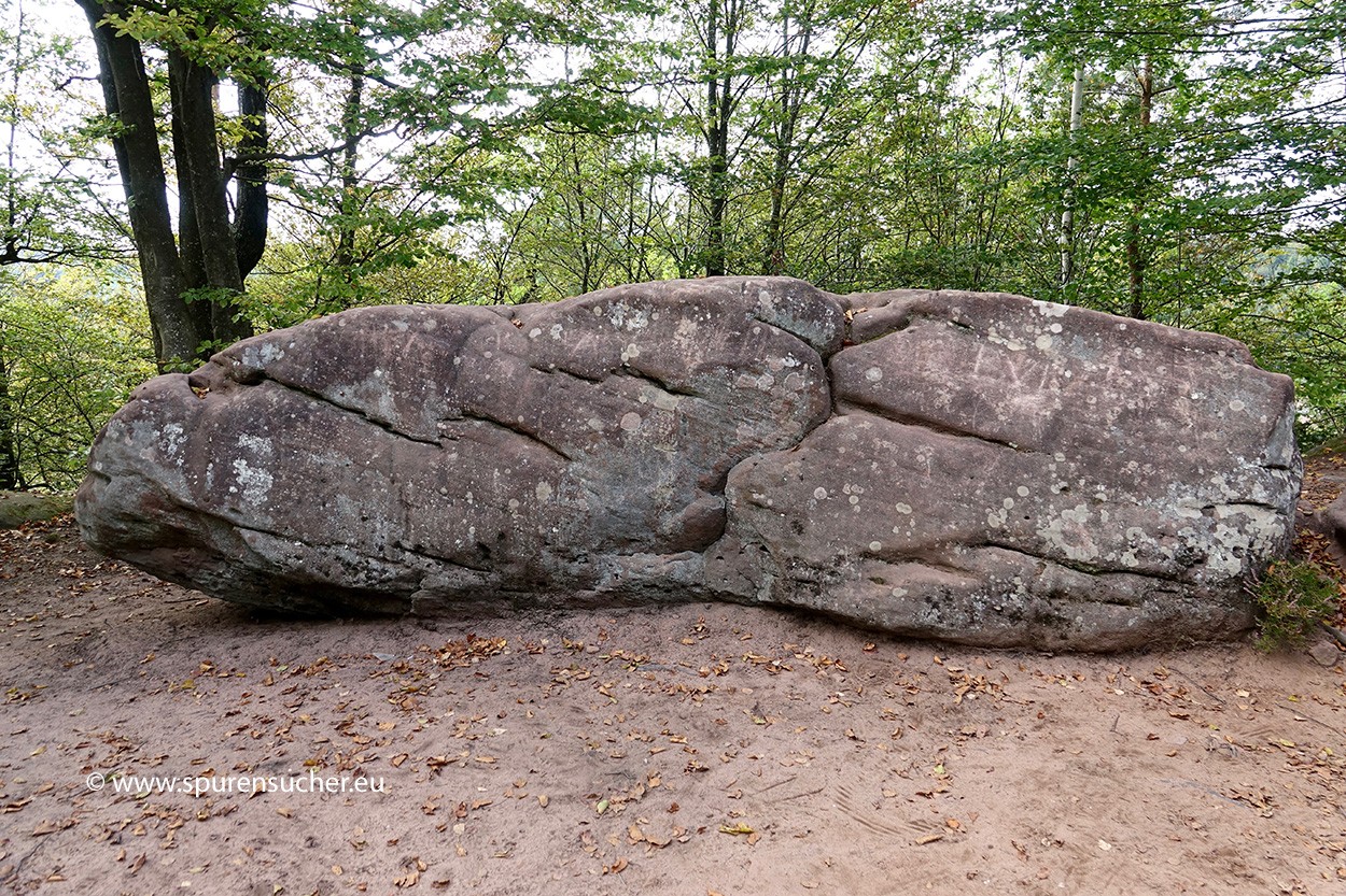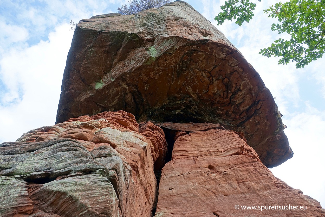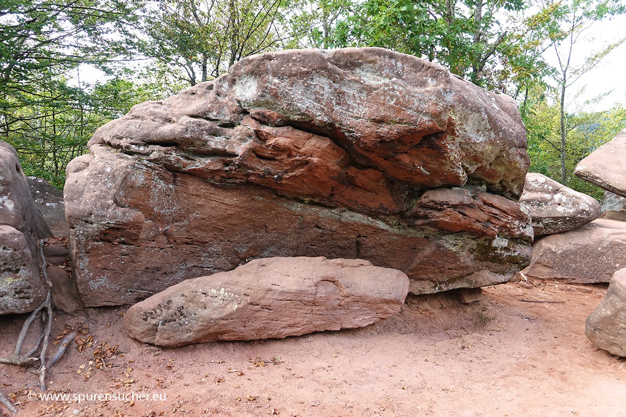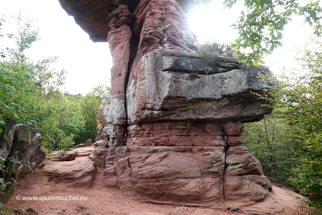 Wenn man sich ihm vom etwa 5-10 Minuten entfernten Parkplatz aus nähert, erhält man einen Eindruck davon, was wahre Größe wirklich ausmacht. Auf einem durchaus wacklig anmutenden Bundsandstein-Gestell liegt eine überdimensionale breite und hohe Felsplatte mit einem Flächenmaß von 50 qm und einer Stärke von 3,5 Meter an der dicksten Stelle. Sie wird auf 300 Tonnen geschätzt.