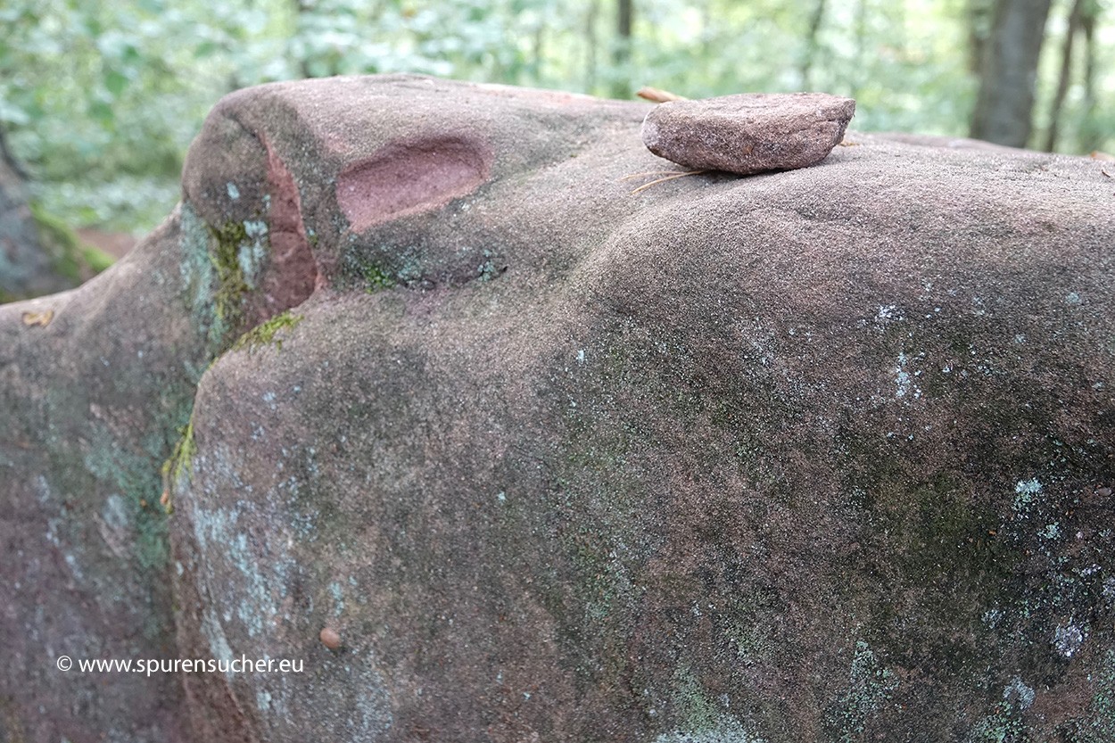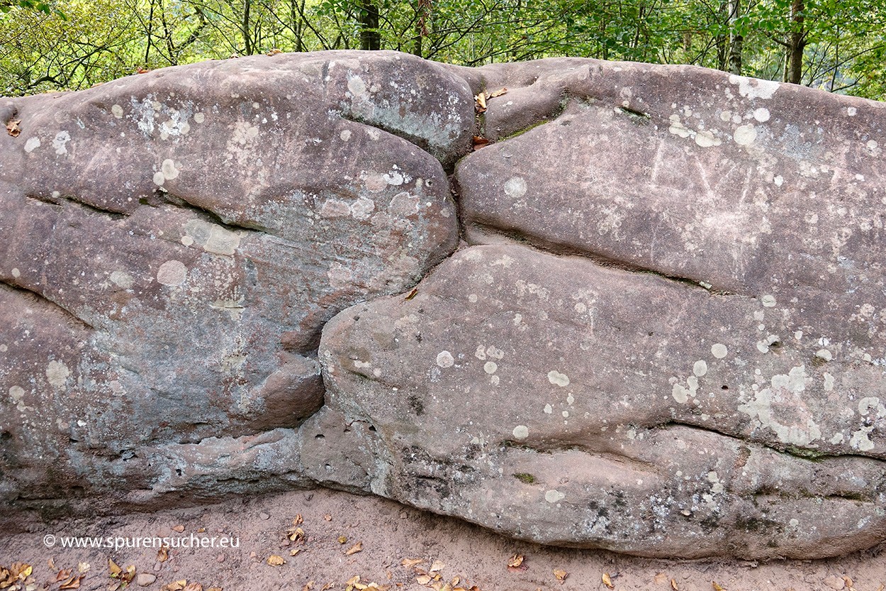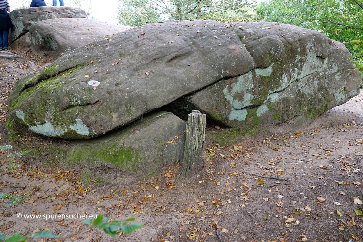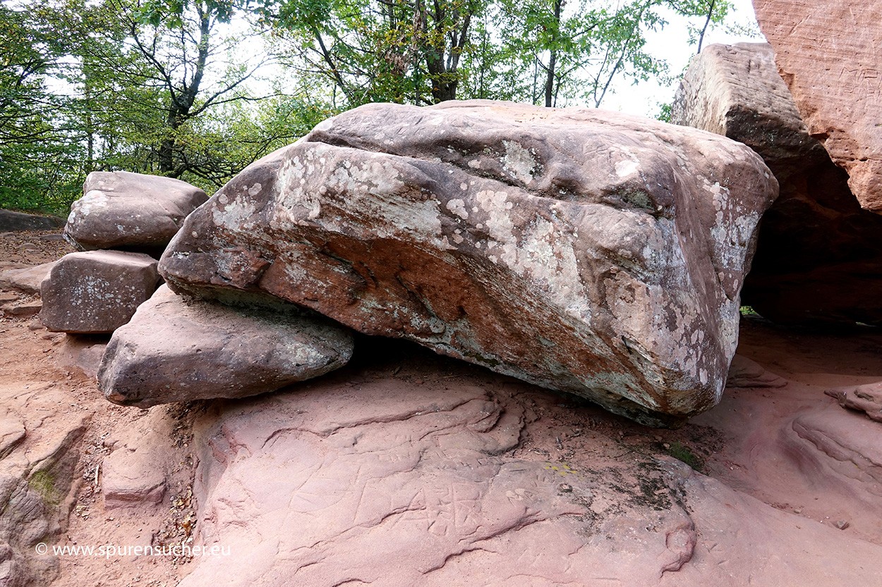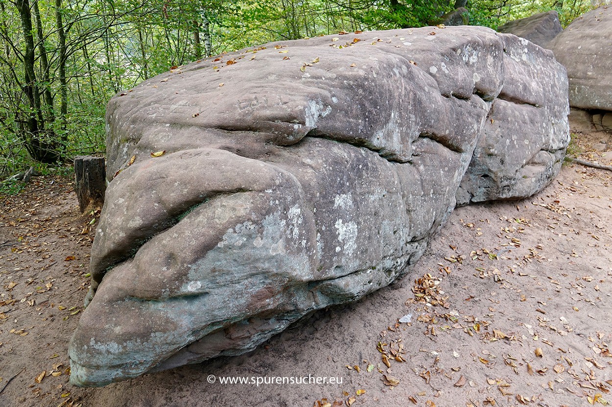 Wenn man sich ihm vom etwa 5-10 Minuten entfernten Parkplatz aus nähert, erhält man einen Eindruck davon, was wahre Größe wirklich ausmacht. Auf einem durchaus wacklig anmutenden Bundsandstein-Gestell liegt eine überdimensionale breite und hohe Felsplatte mit einem Flächenmaß von 50 qm und einer Stärke von 3,5 Meter an der dicksten Stelle. Sie wird auf 300 Tonnen geschätzt.