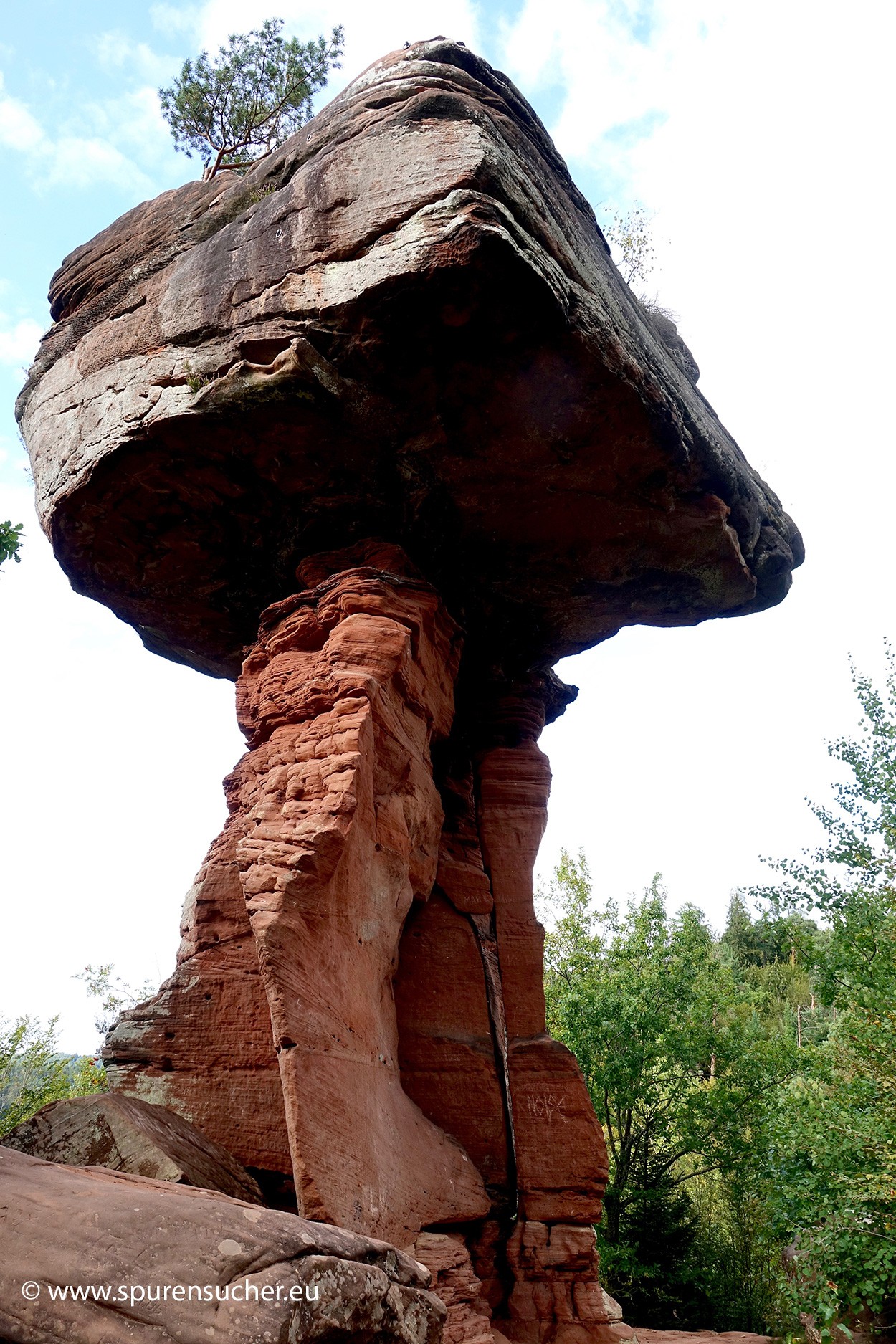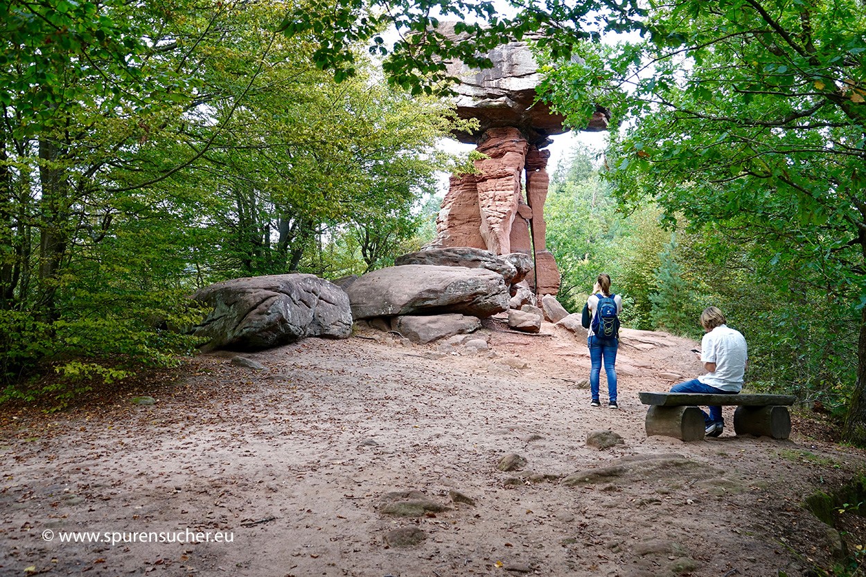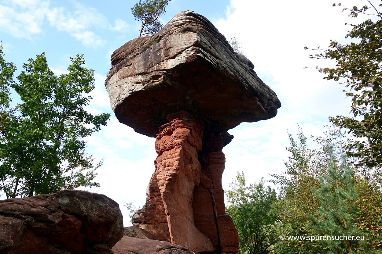 Über Spuren und Hinterlassenschaften der natürlichen Erosionskraft im weichen Bundsandstein stolpert man im Wandergebiet des Pfälzerwaldes an allen Ecken und Enden. Die üppig grüne Landschaft wird immer wieder von Felsformationen unterbrochen, die mit ihren skurrilen Formen an imposante Westernkulissen erinnern. Besonders ausgefallen jedoch ist der 14 Meter hohe Teufelstisch im Hinterweidenthal, der aus meiner Sicht eine herausragende Figur macht.