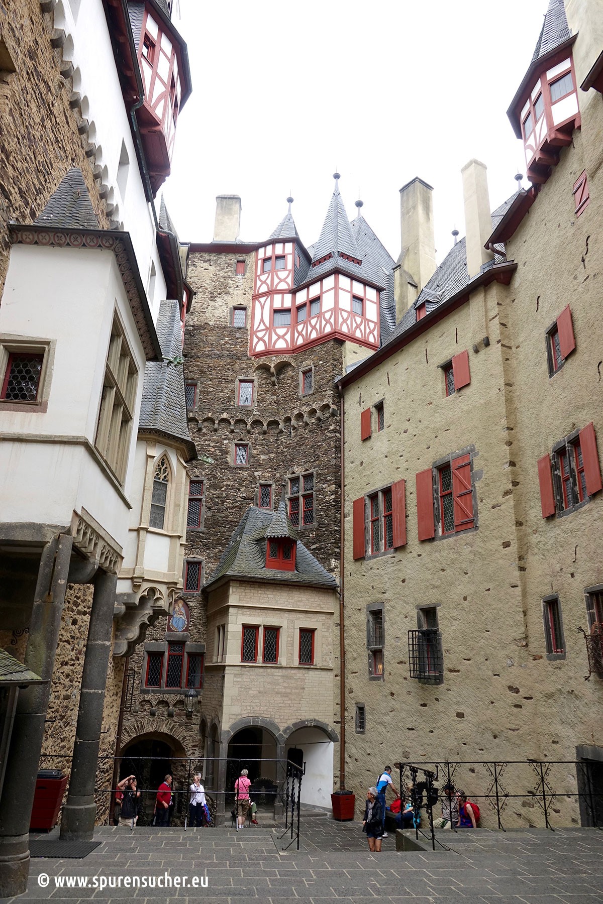 Der Zugang ist imposant, die keilförmige Lage auf dem Rücken eines besonders harten vulkanischen Gesteins war sicherlich gut zu verteidigen. 2017 gehörte ich auch zu den 250.000 Besuchern, die den eindrucksvollen Ort besuchen. Gegenüber den rund 3,5 Millionen Besuchern, die den Mt. Saint Michel jährlich aufsuchen, sicherlich nur ein kleiner Teil. Gegenüber Rothenburg ob der Tauber mit 1,5 Millionen Besuchern jährlich kann sich die Burg buchstäblich sehen lassen. Der Eltz-Clan lässt sich derweil mit den üppigen Eintrittsgeldern sein Anwesen fortlaufend auf Vordermann bringen. Und wenn's mal nicht so läuft – Graf Jakob und Gräfin Ladislaja zu Eltz haben bereits in den 70er Jahren auf ABM-Maßnahmen zurückgegriffen, um die Mauern auf Vordermann bringen zu lassen. Eigentum verpflichtet eben nicht immer … ;-) … nur weil das Märchenschloss jahrzehntelang die Rückseite des 500 DM-Scheines geziert hat, muss der Eigentümer der Burg davon nicht immer ausreichend in der Tasche haben (*Ironie off*). Zumindest konnte man uns solche Geschichten bis zum heutigen Tage weis machen …