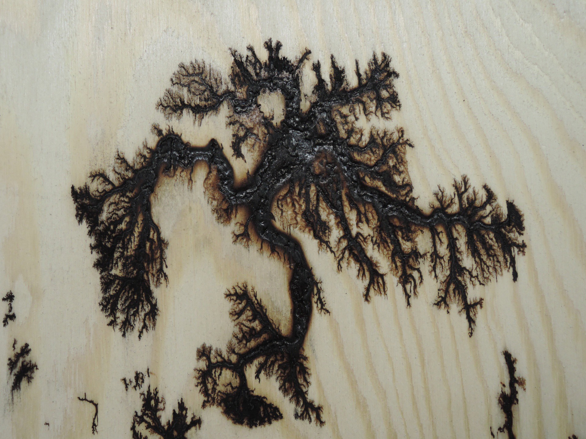 Hier eine Lichtenberg-Verästelung, ausgelöst durch elektrische Hochspannungsentladungen (in diesem Fall auf Holz). Wer sich intensiv mit Landkarten auseinandersetzt und mit einer solchen Theorie etwas anfangen kann, findet diese Strukturen über große Dimensionen überall auf der Welt.