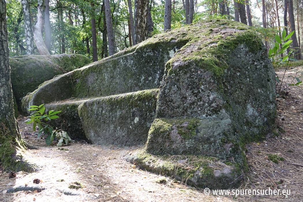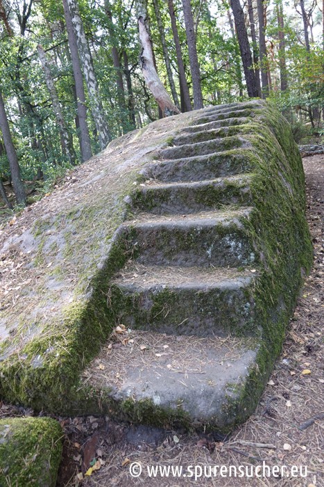 Direkt daneben befindet sich ein Felsaufgang mit Treppenstufen, die praktisch im Nichts enden. Sicherlich handelte es sich hier um einen Kraftort, der einst für andere Zwecke genutzt wurde. Die exakt 11 Stufen könnten auf Initiationsriten hinweisen, die weitaus älter sind als die des Mithraismus. Zum römischen Initiationskult gehören jedenfalls lediglich 7 Stufen … Vielleicht liege ich auch völlig falsch, das nebenstehende "Kanapee" war vielleicht kein Sitzplatz für Hohepriester, sondern Teil einer komplexeren Anlage für völlig andere Zwecke. Die Monolithen von Asuka Nara (Japan) erinnern mich jedenfalls daran. Das "Kanapee" ist aus meiner Sicht mehr als nur eine Sitzgelegenheit …