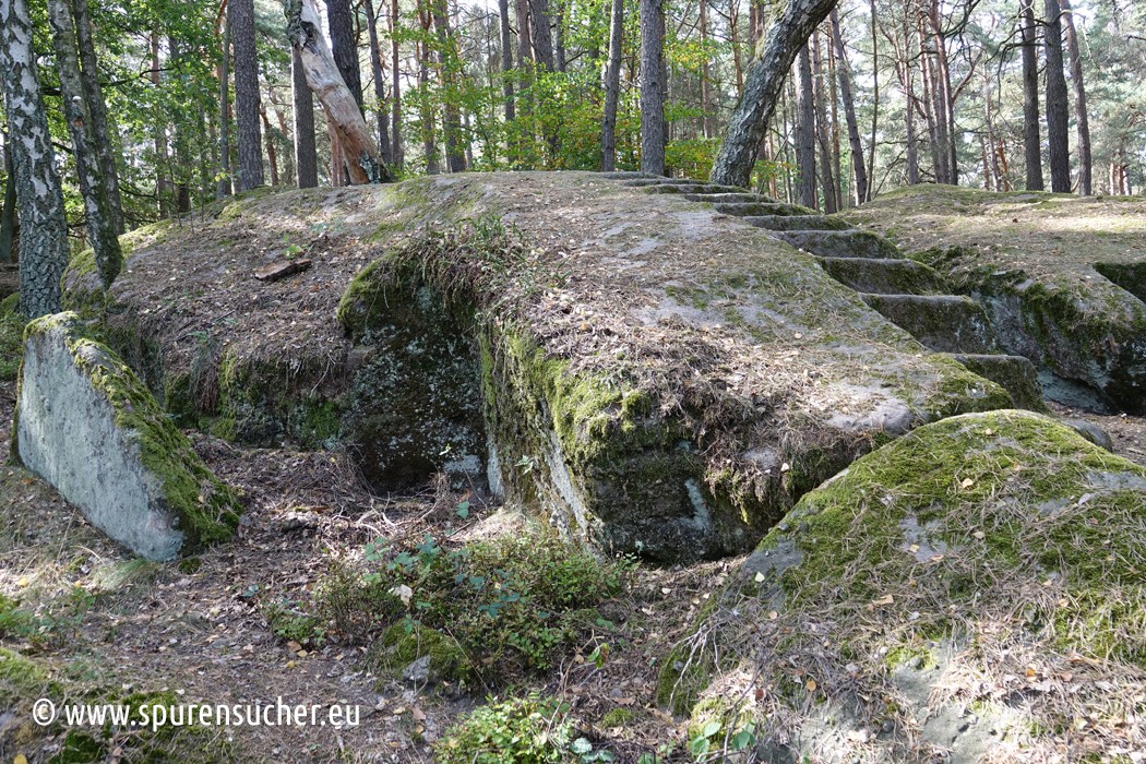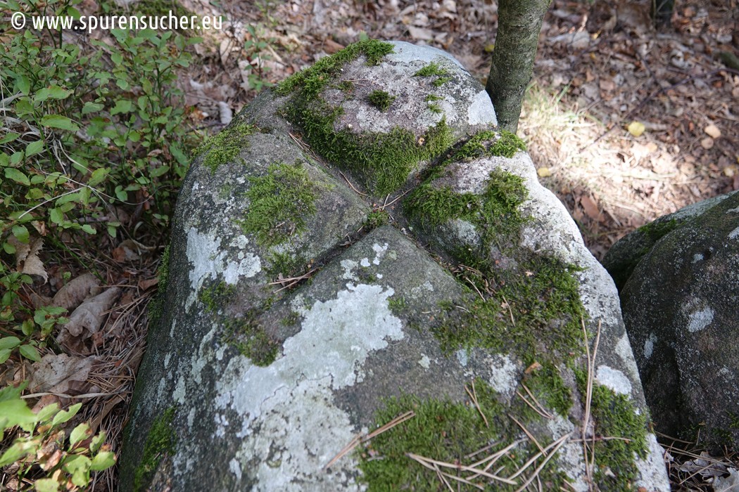 Bei näherem Hinsehen stellt man fest, dass weitere bearbeitete Felsen unter dem Laub und der Erde verschwinden und man sicherlich alles daran setzt, dass das auch so bleibt. Man erahnt auch Hohlräume unter der Erde. Zwischen den beiden großen Felsen federt der Boden etwas nach. Wissenschaftlich ist hier jedenfalls nichts ernsthaft aufgearbeitet worden. Stattdessen verkauft man den Ort als mittelalterliche Einsiedelei (die es vielleicht ja auch viel später mal war): Angeblich seit der Ort zwischen dem 14. und 16. Jahrhundert bewohnt gewesen. Die Verpflegung für den Einsiedler mussten die Bürger von Leistadt raufbringen.