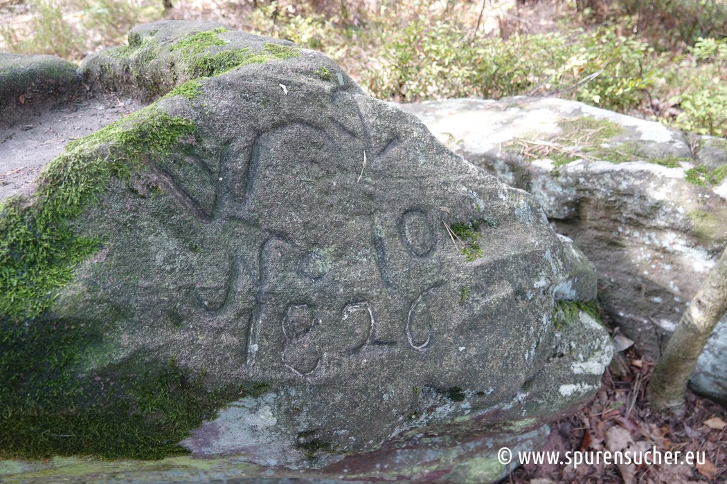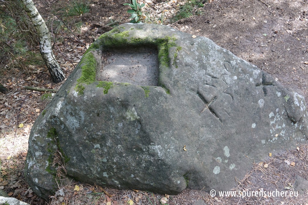 Dem Ort etwas vorgelagert befindet sich die sogenannte "Suppenschüssel". Auffällig ist die viereckige Einfassung mit abgeflachter Kante bzw. Doppelkante auf einer Seite. Als Umtrunkbehälter war das sicherlich ursprünglich nicht gedacht, auch wenn viele auf Anhieb erst einmal wieder an das typische Opferbecken denken. Die Ideen gehen von Modellpyramide (ohne Schlussstein), Keltenkreuzsockel bis Behälterfassung. Auch Einfassungen für Statuen wären denkbar … davon gibt es genügend Beispiele in Indien. Für weitere Vorschläge bin ich dankbar. Seitlich sind interessante Petroglyphen zu finden, die vermutlich auch erst viel später nach der Fertigstellung dieser Struktur dort eingraviert wurden (zumindest ein Teil davon – wie ja auch die Zahl 1826 belegt).