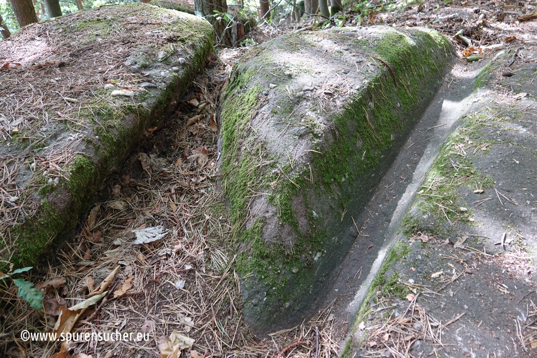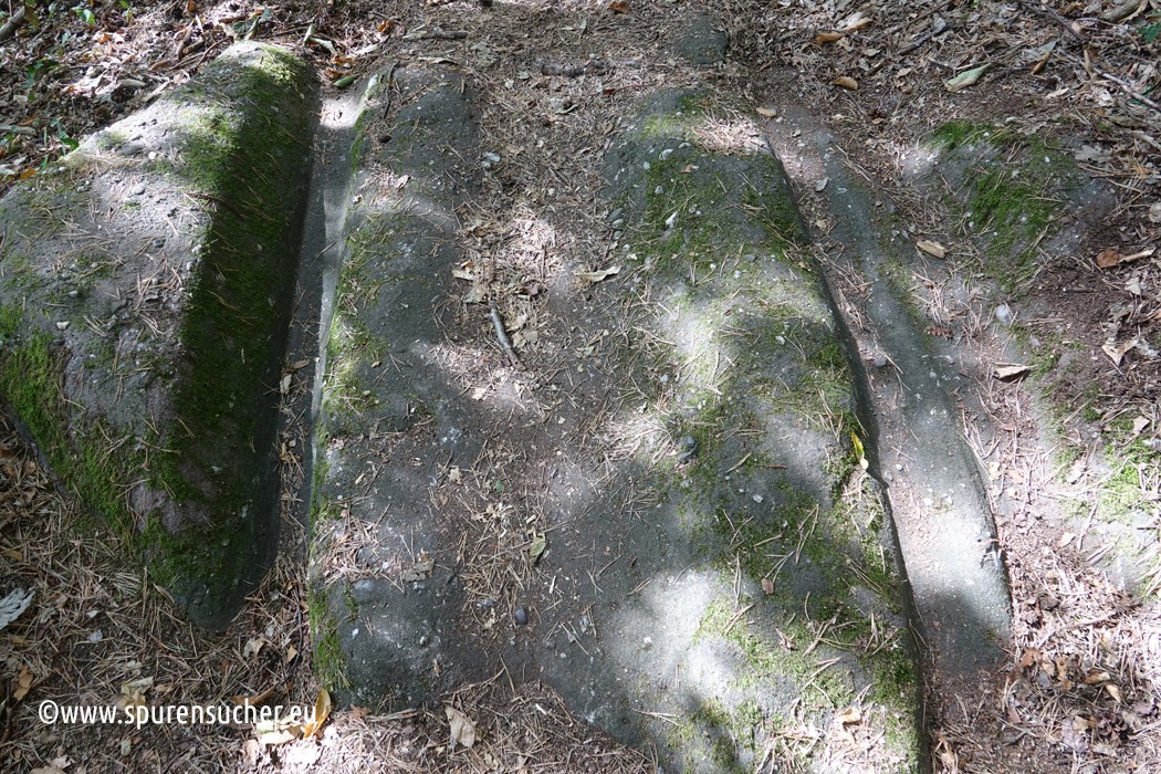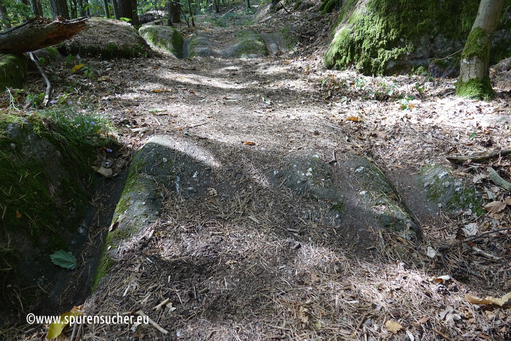 In etwa 4-5 Meter großem Abstand zwei etwa jeweils 2,5 Meter parallel laufende Cartrut-Spuren. Die "Schiene" zur Rechten verläuft doppelt. Selbstverständlich gibt es hier eine Verbindung beider Spurenabschnitte, doch verschwindet der Mittelteil wie auch der restliche Bereich (bergaufwärts- und abwärts) unter dem Waldboden.