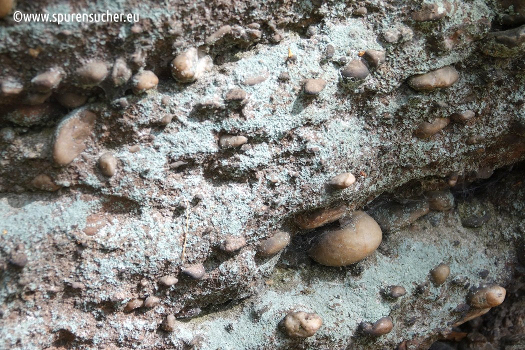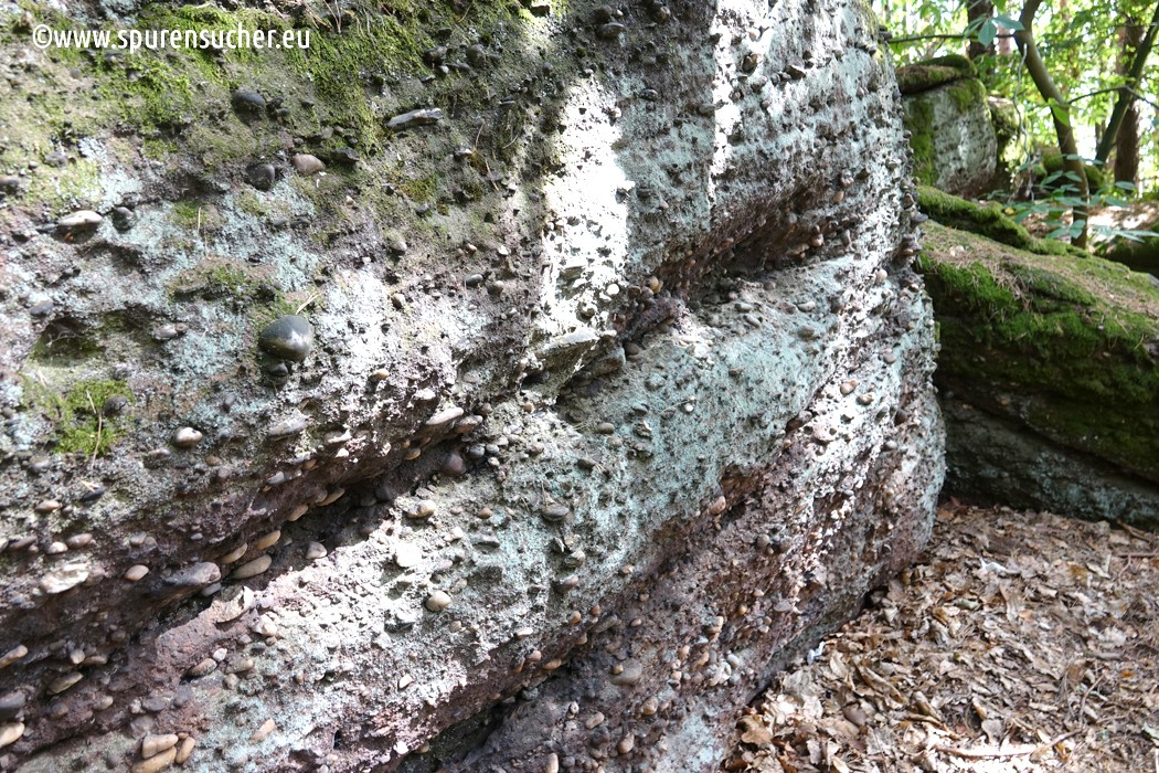 Im Sandstein sind praktisch überall auffällig große Kiesstücke eingeschlossen. Für Betonprofis ein vertrautes Bild, da so etwas eine eher mäßige Betonqualität auszeichnet. Damit will ich nicht behaupten, dass hier einst künstliche Vorgänge oder gar Geopolymere eine Rolle spielten. Allerdings verweise ich hier auf die Möglichkeit einer kurzfristigen Erhärtung von halbfester bzw. teilflüssiger Masse (Link). Geologen würden mir spätestens an dieser Stelle an die Gurgel gehen, da dies keineswegs gängige Lehrmeinung ist. Aber schaut es Euch zunächst selbst einmal an.