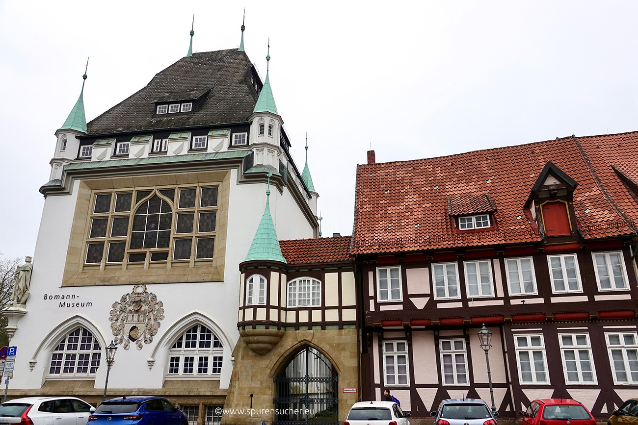 Der seltsame Bau des sogenannten Bomann-Museums gegenau gegenüber vom Schloss: Dieses Gebäude soll erst Anfang des 20. Jahrhunderts entstanden sein. Außer einer Skizze des fertigen Museums ist hier kein Material über den Baufortschritt oder dessen Pläne auf Anhieb zu finden. So imposant es wirkt, als Unbedarfter kommt man nicht so schnell darauf, es hier mit einem Museum zu tun zu haben.