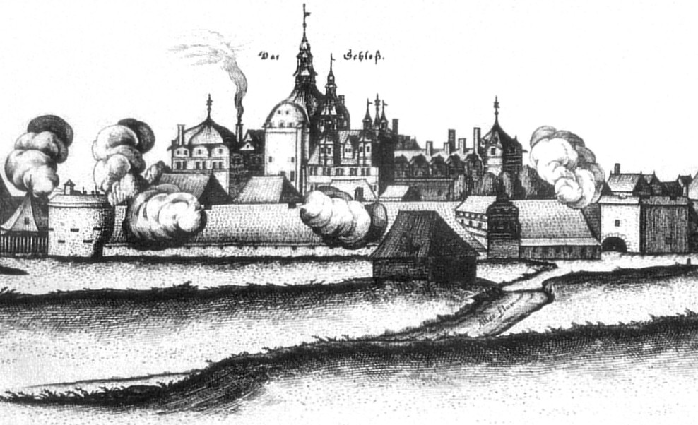 Stich von 1646 vermutlich vor oder während der Umbauten – offenbar gab es damals weitaus mehr Gebäudetrakte; die Bollwerke waren ebenfalls recht imposant. Sollen die Rauchwolken Kanonenfeuer simulieren? Interessant auch die wiederholte Akribie der Dachspitzen.
