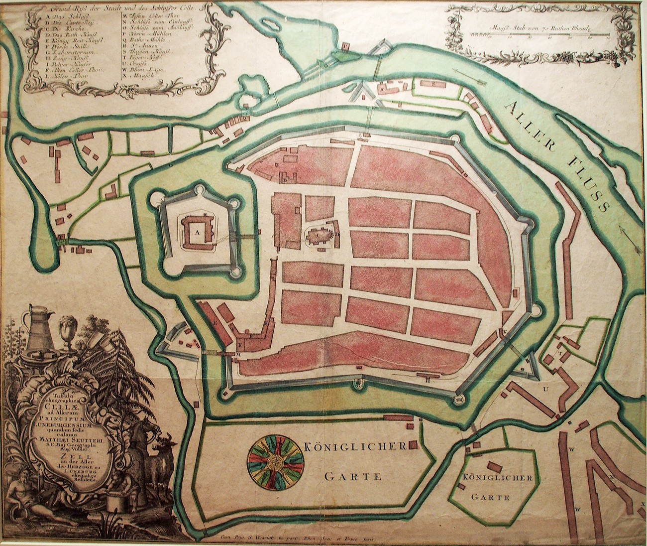 1740 scheint das Schlossgebäude im Grundriss schon weitaus einfacher strukturiert aus als auf dem oberen Stich. Offenbar hat man sich im Zuge der Zeit zahlreicher Gebäudepartien entledigt. Hier sieht man sehr deutlich die heute nicht mehr existenten Wassergräben rund um die Stadt und die Schlossinsel sowie parallel zur Aller und komplett zum Nebenarm.