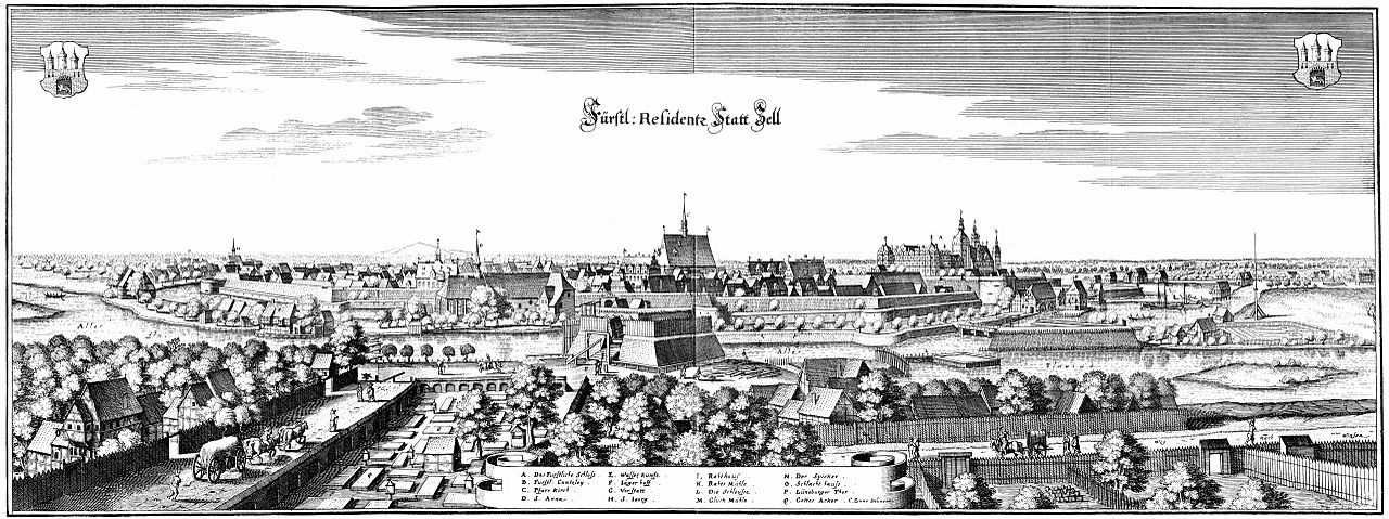 Celle von 1654 (Matthäus Merian); noch komplexere Ansicht; im Hintergrund das Schloss aus anderer Perspektive und komplexeren Gebäudestrukturen als heute; einige Türme fehlen; Quelle Wikimedia Commons (gemeinfrei)