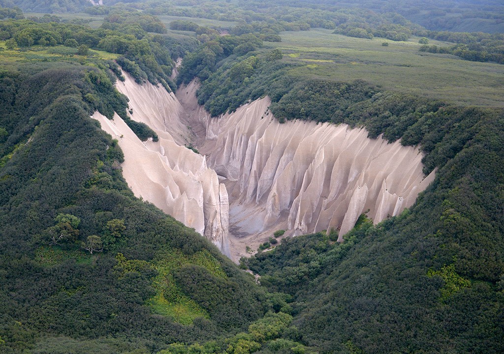 Tief auf der Halbinsel Kamtschatka liegt ein einzigartiges Tal: Kutkhiny Baty – die Hubschrauberansicht zeigt eine klaffende Wunde in der Landschaft.