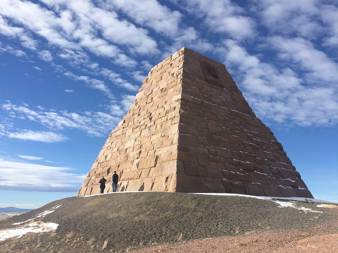 Das Design der Pyramide und ein paar technische Daten: Die behauenen Granitblöcke an der Basis wiegen jeweils einige Tonnen und sind jeweils mindestens 1,50 x 2,50 Meter groß. Richardson soll hier extra rosa Granitbrocken vom nahe gelegenen Felsvorsprung Reed’s Rock abgebaut haben. Die Gebrüder Norcross sollen dann den Bauauftrag bekommen haben und mit den Arbeiten 1880 begonnen haben. In Sherman wurde eine kleine Siedlung gebaut, um die 85 Arbeiter unterzubringen, die in den folgenden zwei Jahren an der Fertigstellung des Denkmals beteiligt waren. (Glücksspiel und Trinken ware angeblich nicht erlaubt).