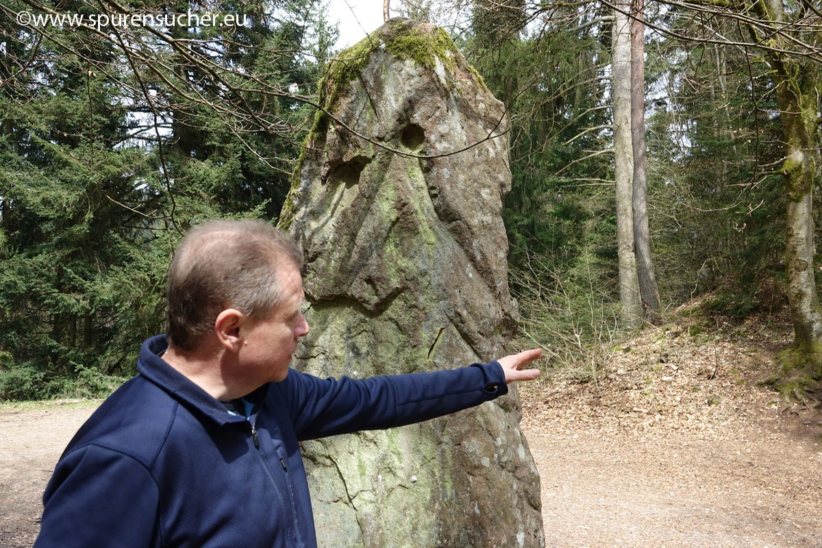 Dass dieser Ort noch etwas mehr hergibt bzw. eindeutig megalitische Strukturen aufweist, bedarf keiner langen Forschung. Wenige Meter daneben steht ein Menhir, den eine respektlose Rastplatzgravur "ziert".