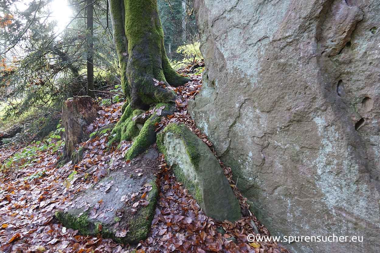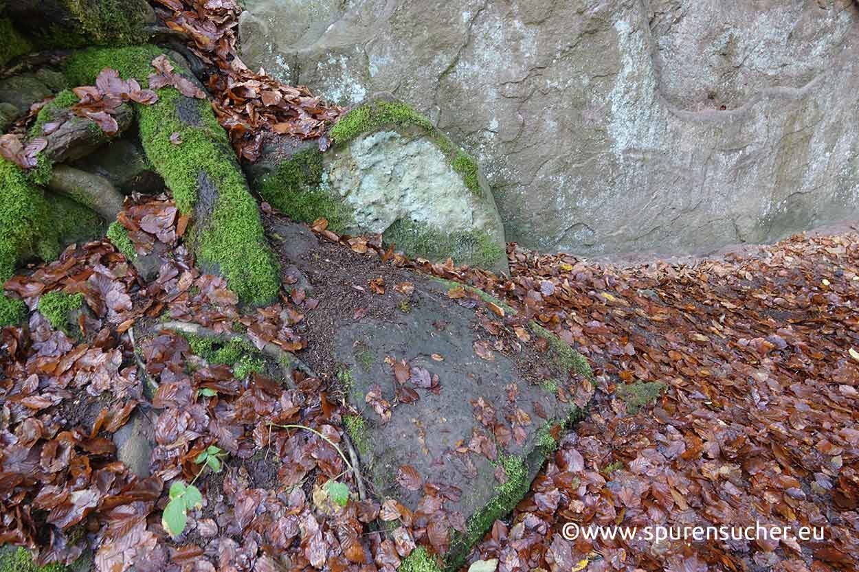 Auf der linken Seite der Platte finden sich im Boden merkwürdig verkeilte Felsen, die möglicherweise den großen "Runen"felsen von vorne stützen.