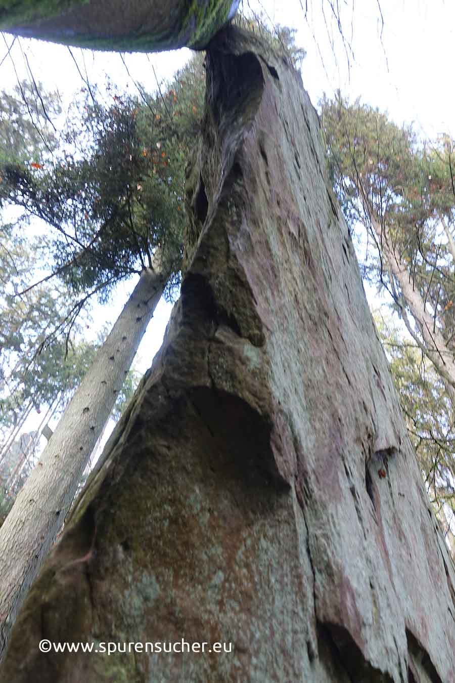Auf der linken Seite läuft die stehende Felsplatte nochmals spitzkantig zu und kollidiert mit einem dort gewachsenen Baum, der sich in seinem Wachstum vom Hindernis nicht beeindrucken ließ.