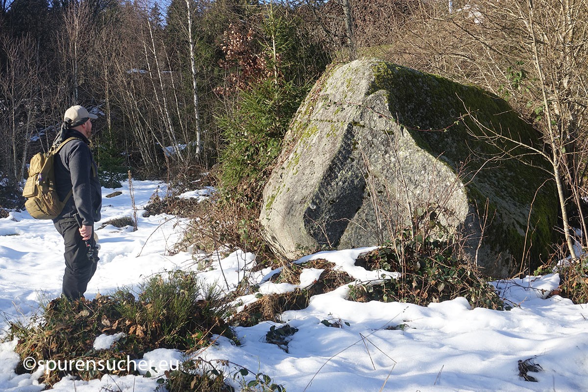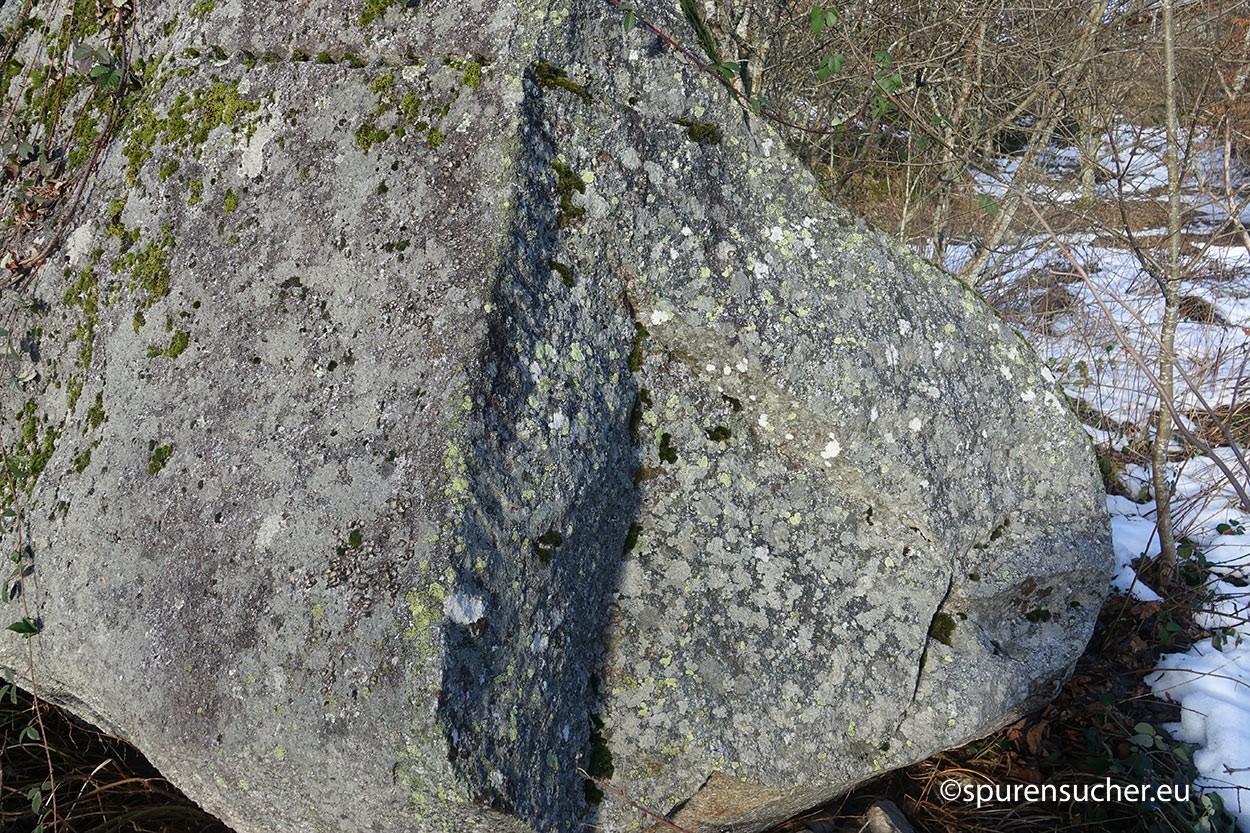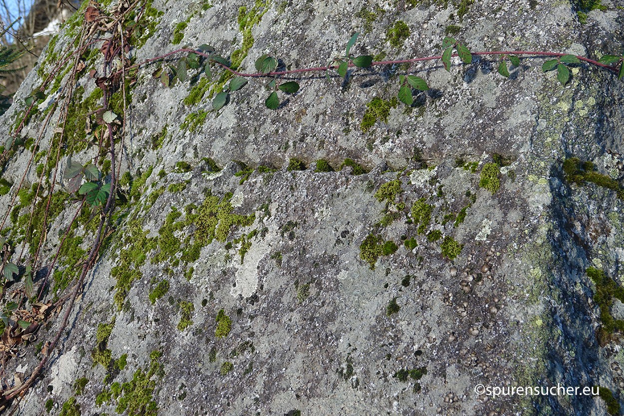 Auf den ersten Blick nicht ersichtlich – Es handelt sich um einen imposanten Granitfelsen, der auf der Oberseite eine Schalung aufweist. Von unten kann man es als ahnungsloser Wanderer nicht sehen und man muss schon die Neugierde entwickeln, sich selbst davon zu überzeugen. Jemand vorher war schon so investigativ und das Ganze hat sich halt unter Megalithfreunden herumgesprochen. Der Felsen ist deutlich über 2 Meter hoch, man hat also keinen so guten Zugang zur eigentlichen Schale.