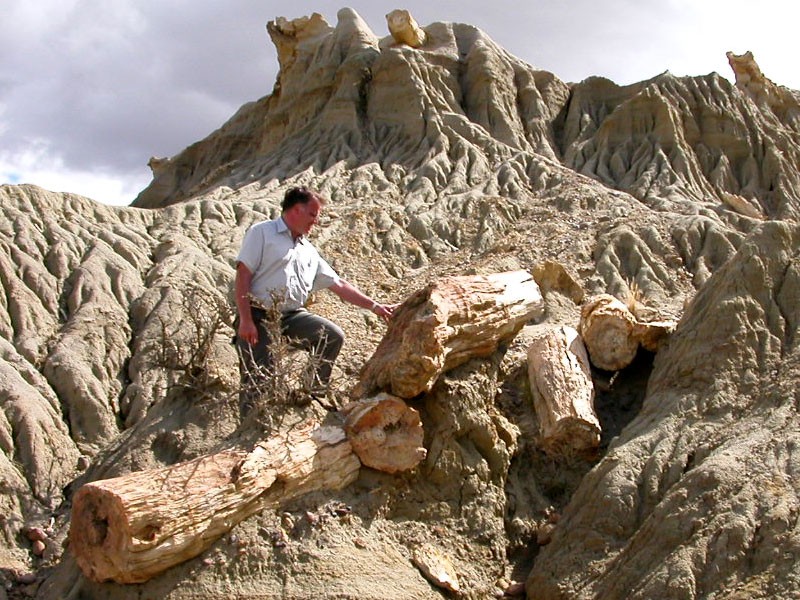 Der versteinerte Wald von Sarmiento (30 km südlich von Sarmiento in Argentinien) offenbart ebenfalls Überraschendes: Auch hier findet man vor einer Bergkulisse versteinertes Holz. Allerdings steckt hier das eine oder andere Stück noch mitten im Berg. So, als sei es ein Teil davon. Eventuell Teil oder Ast eines monströsen Baumstumpfes?