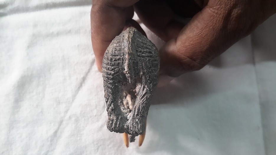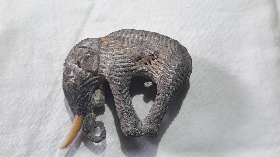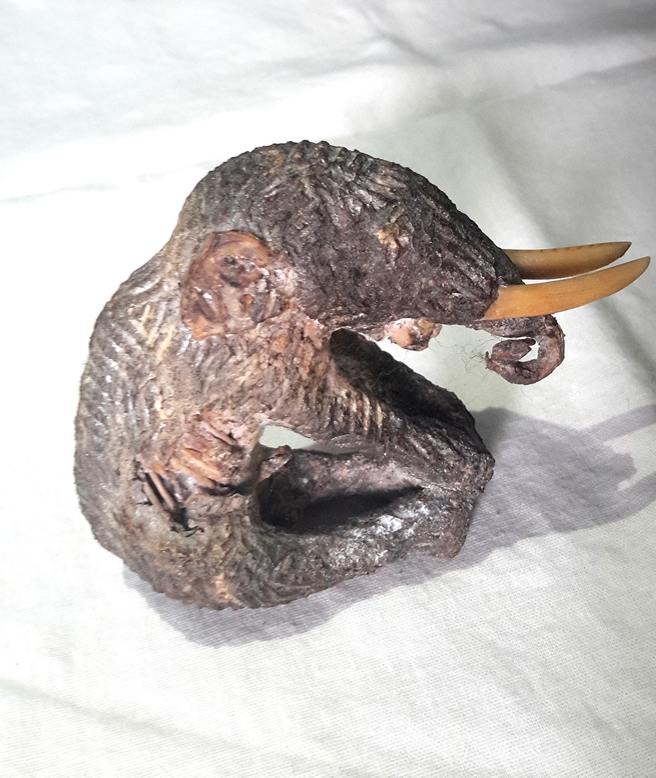 (Abbildungen oben, links und unten: Fotos eines mumifizierten Wasserelefanten)