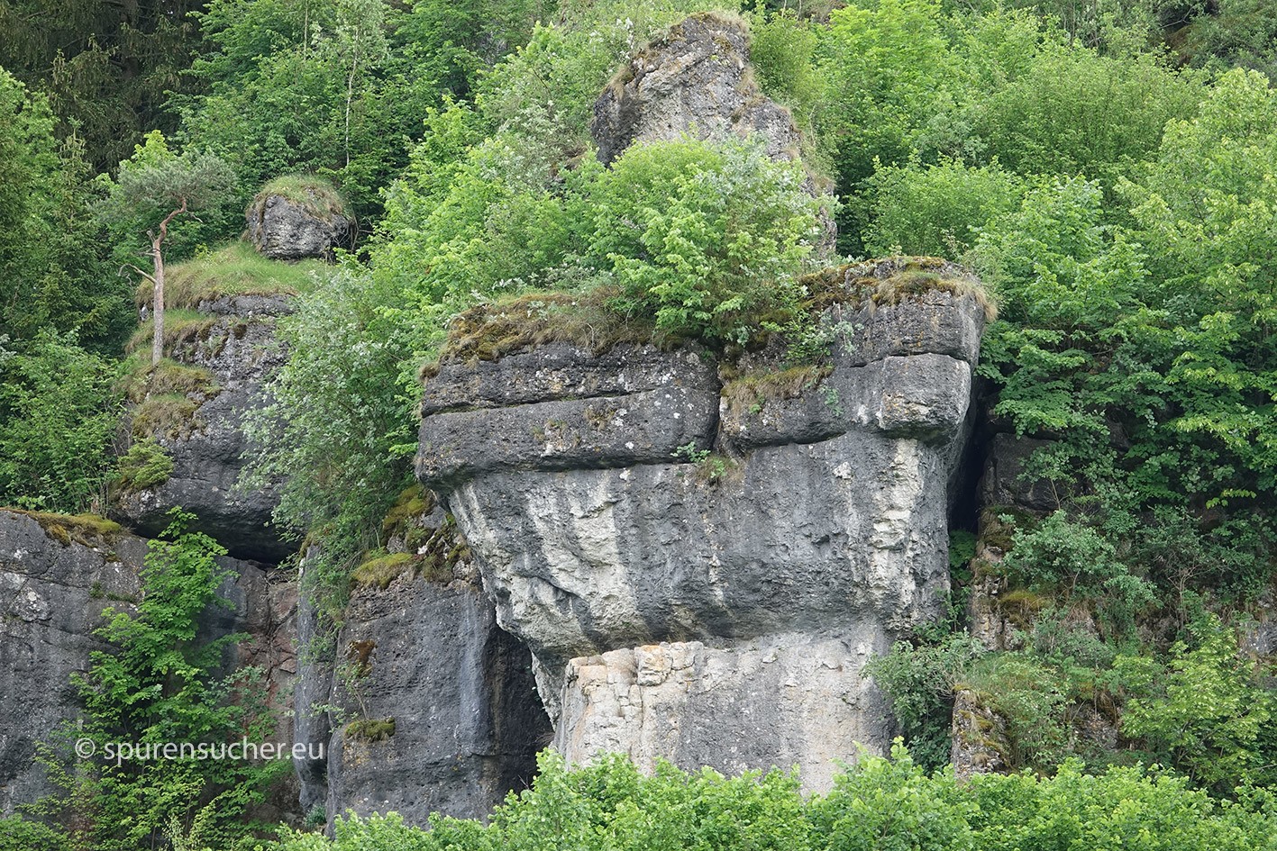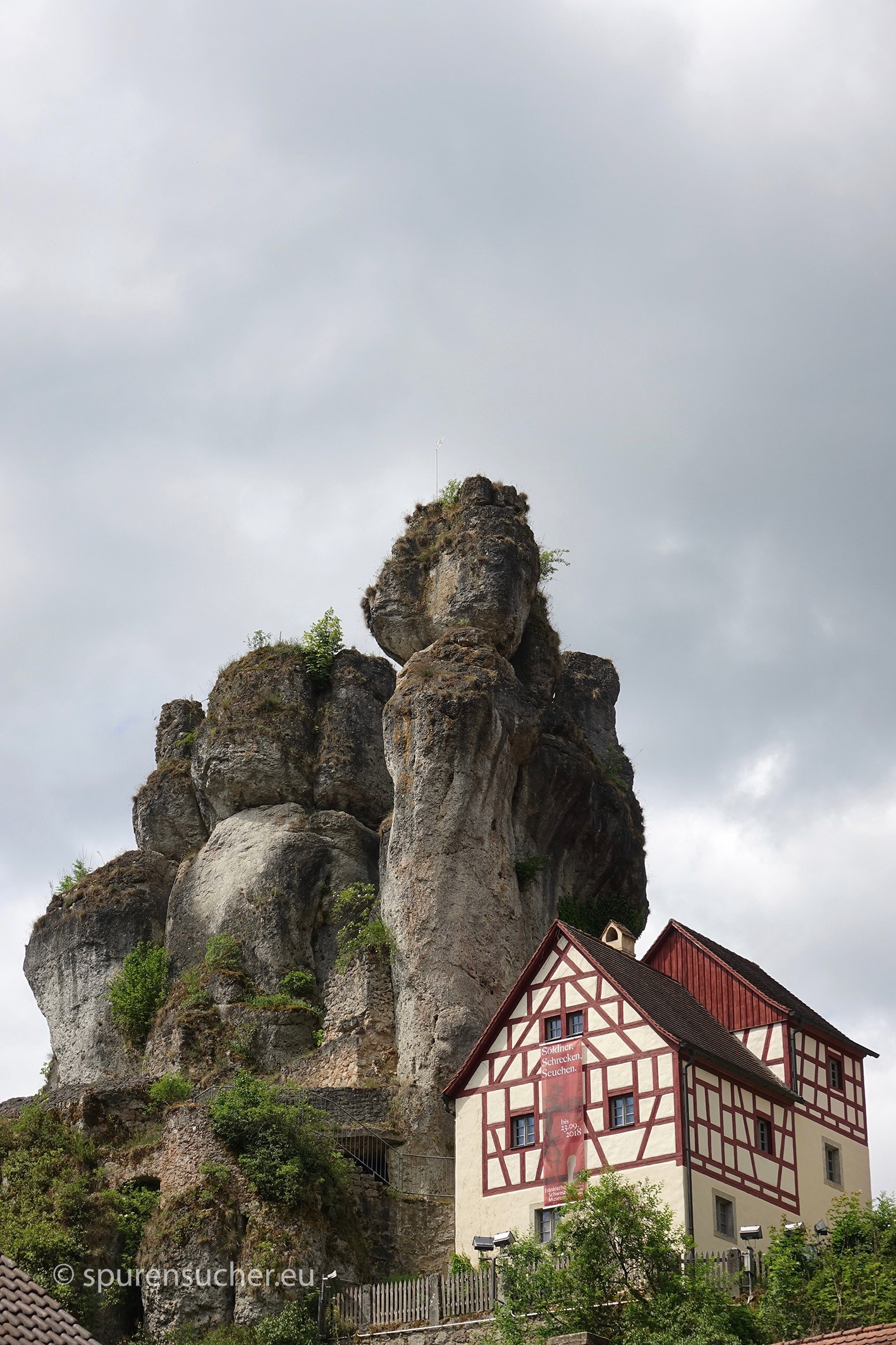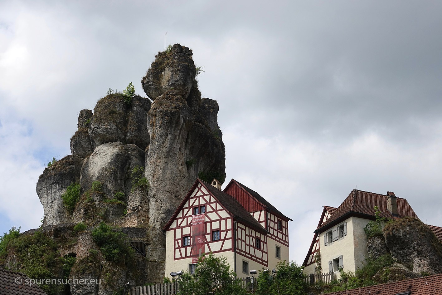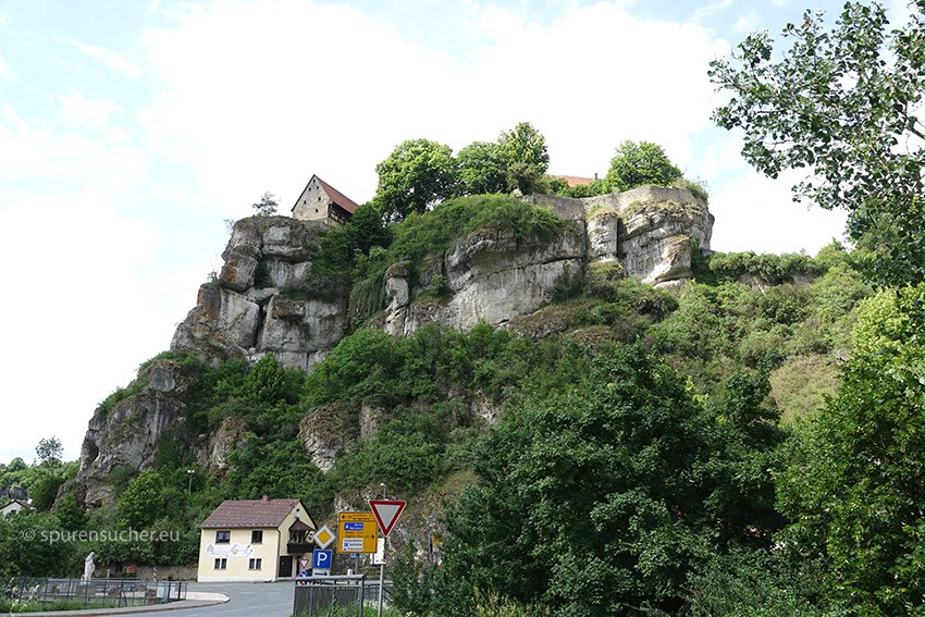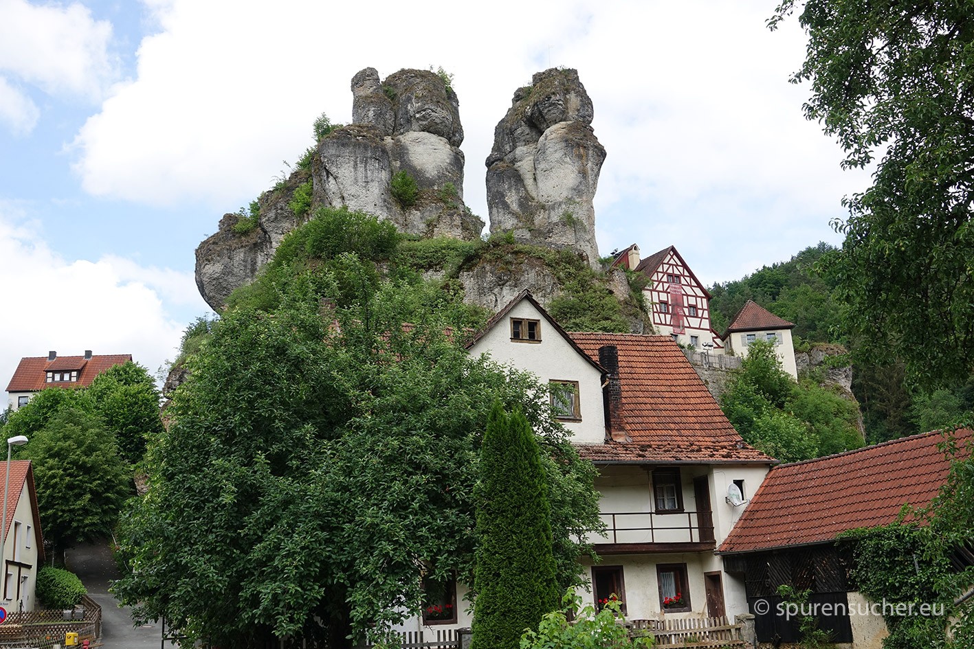 In the immediate vicinity of the village of Pottenstein there are further interesting rock formations at lofty heights, which were used as castle rocks. It is Tüchersfeld, strictly speaking upper and lower Tüchersfeld. In both cases it was stated that the reason for the construction of the castles was the control of the road and the river crossing. Today only castle remains exist there.