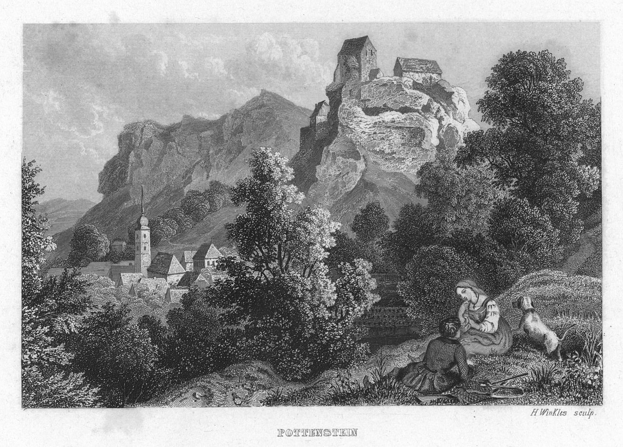 Pottenstein castle from northwest, steel engraving (1840) by Henry Winkles; Wikimedia Commons (>> Link)