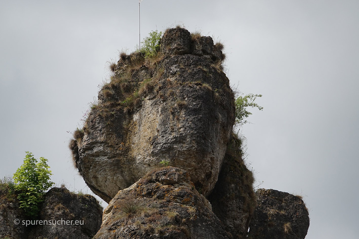 Close-up of the uppermost rock section Nieder-Tüchersfeld. Risky position ...