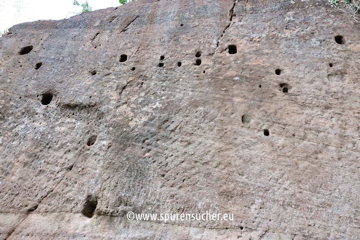 Large gaping openings or shelters in the wall with integrated seating steps confront the attentive visitor with new questions concerning the original purpose. The same applies to the unexplained smaller wall openings. However, one has always been able to find a way there via narrow projections.
