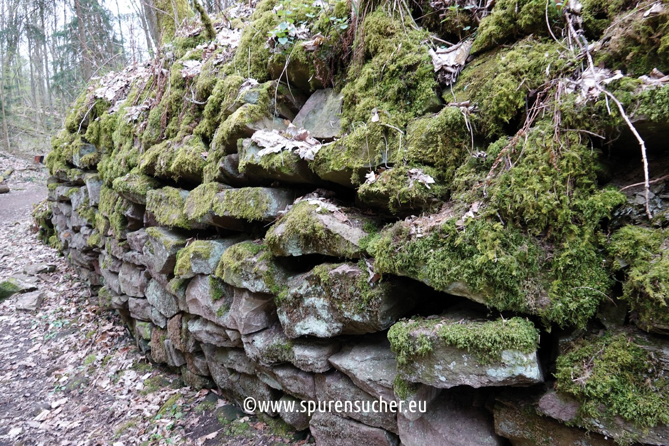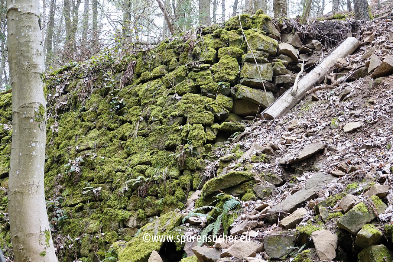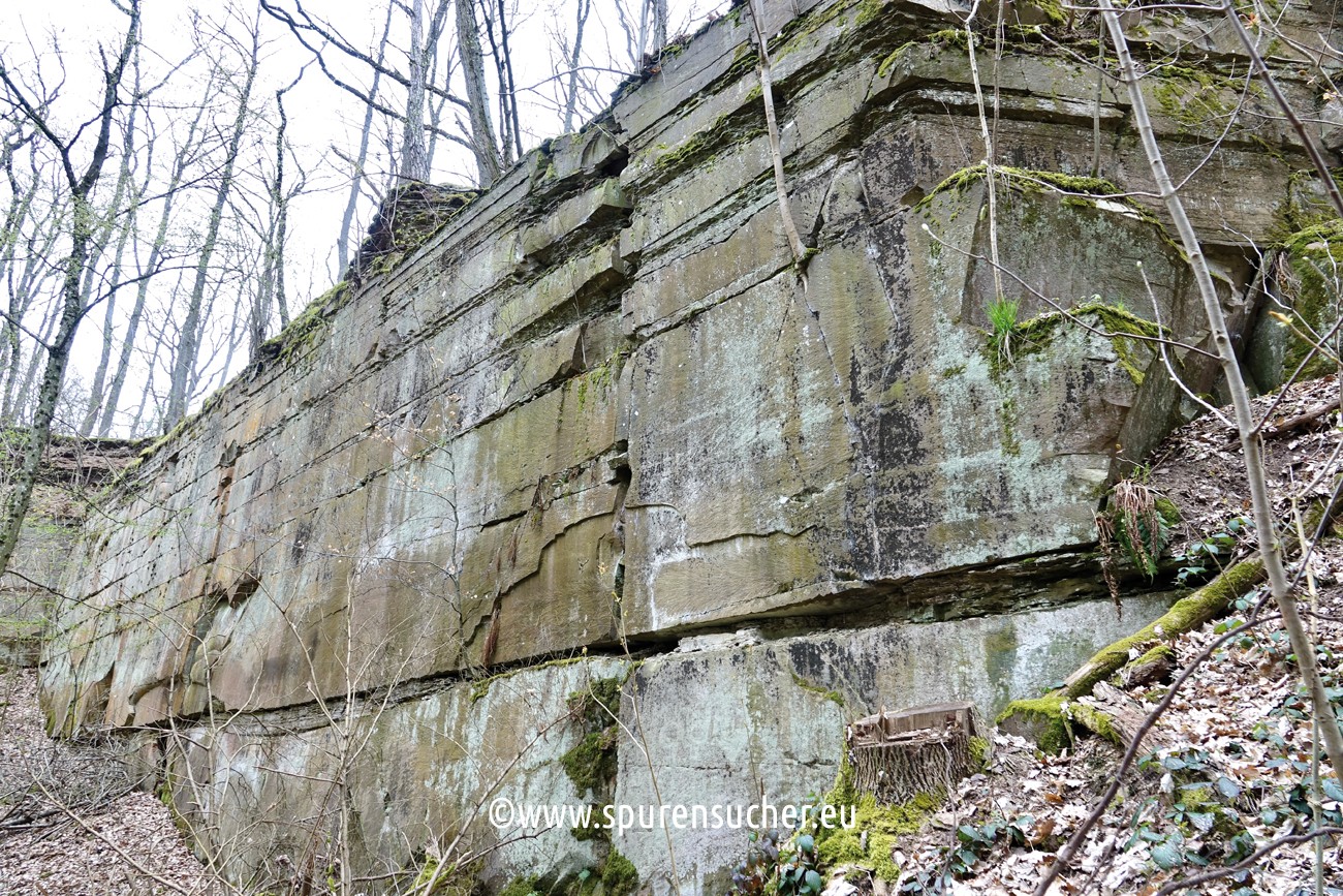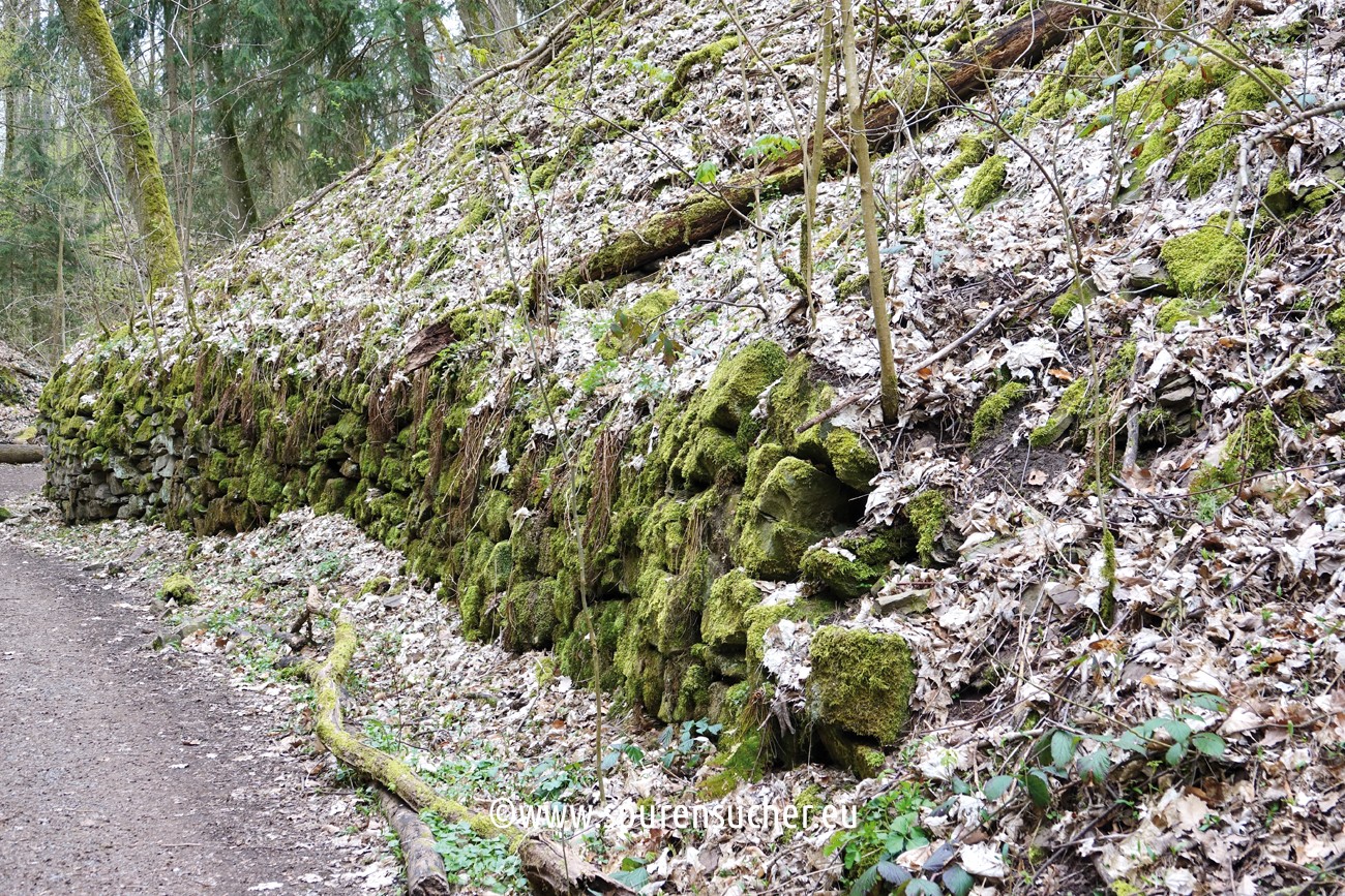 Die Zeitung Heilbronner Stimme zählt den Ort zu den kühlsten in der Region. Sie schreibt: "Die Luft sickert durch die Halde und kühlt dabei ab. Unten entsteht eine leichte Brise. Dort herrschen ideale Bedingungen für den gelappten Schildfarn. Dieser Farn gedeiht an schattigen, kühlen und feuchten Plätzen." (Source) Well, apart from the steep slopes perhaps nothing special, if it weren't for these walls. Everywhere you can find dry-stone walling at the edges of the quarry, which rises up in steps. Some of them are opposite or directly in front of the respective demolition site. According to calculations by the amateur researchers Maglith Pyramids - Cairn Research Society, they reach a height of up to 20 metres. If you look closer, you will discover a neatly worked dry stone wall practically behind or at the edge of each embankment.