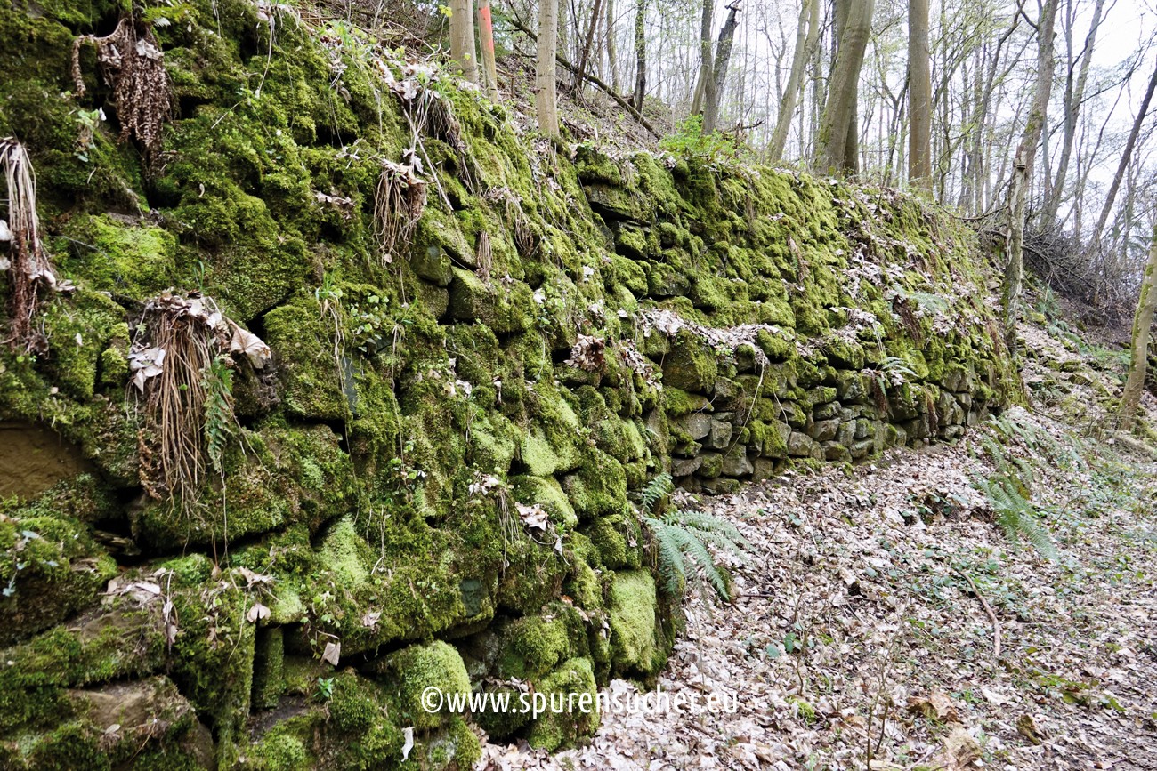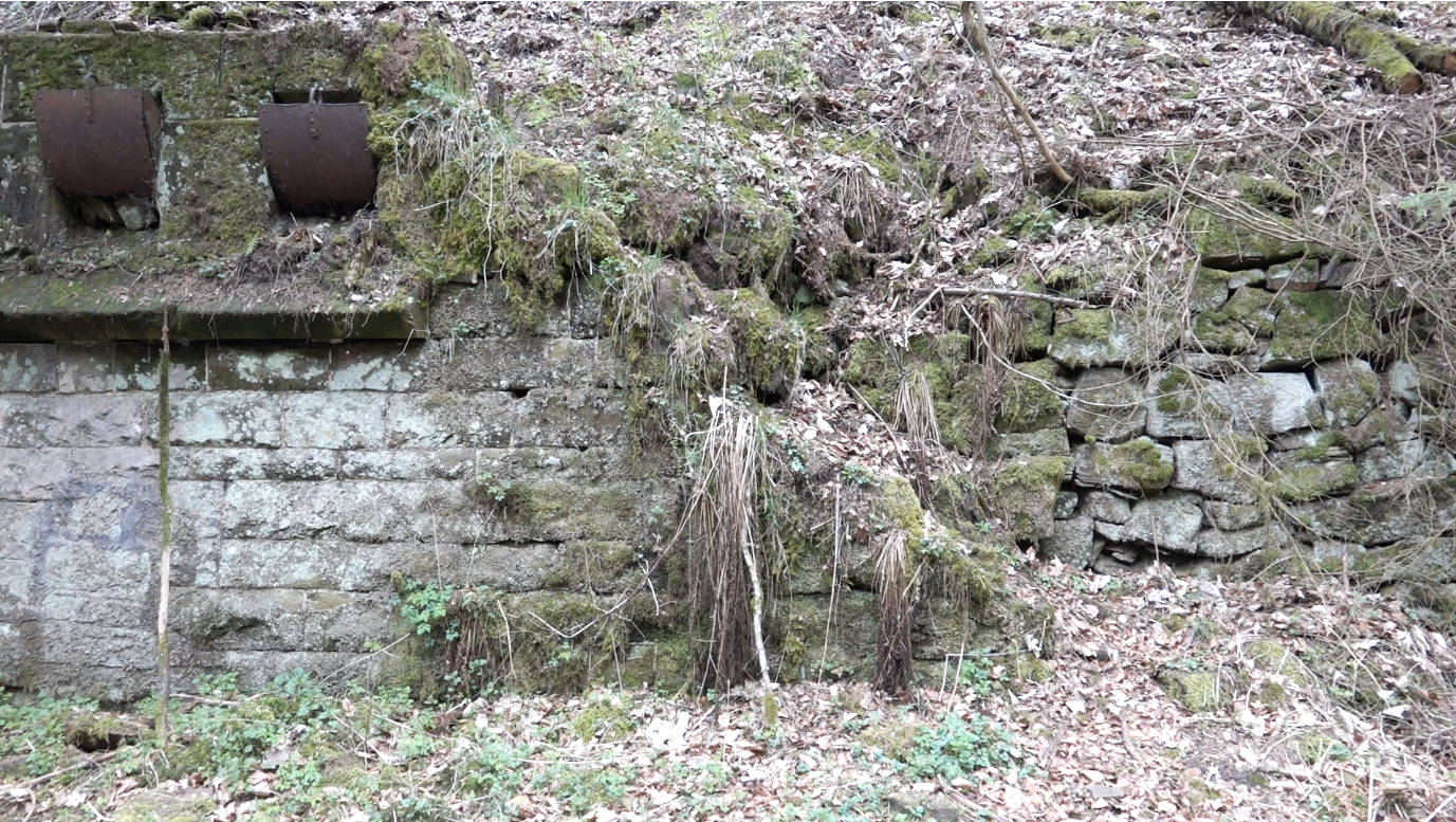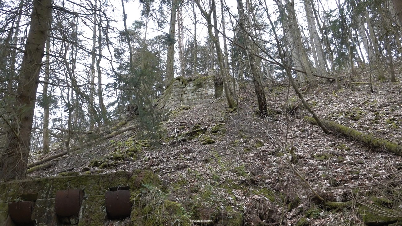 The entire complex was apparently cut through by blasting and road construction, so that no coherent structure is visible or recognisable from the outside. Behind the lush wall remains, clay can be found in many places, but this was also often removed later and made the wall structures unstable. After this first visit, which unfortunately also prevented me from seeing the filled-in entrances, which other amateur researchers had already discovered, many questions remained unanswered.