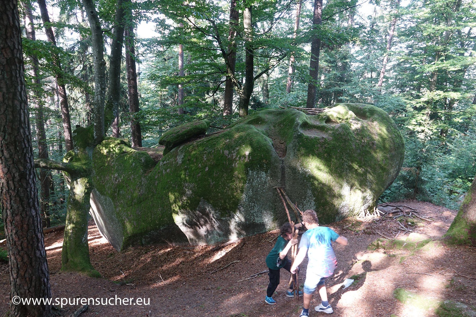 You need a ladder to climb the massive rock, which in my opinion has already been shaped accordingly. The top edge is about 2.5 m high (at least). The kids managed to get up there using sturdy branches. The term "sacrificial stone" is probably misleading anyway, as the water collected in it is considered "holy" water on the other side. It is more likely that this was a facility that promised people therapeutic benefits. The grooves, bowls and indentations here rather promise extensive treatment, which the Christians were certainly anything but open-minded about.