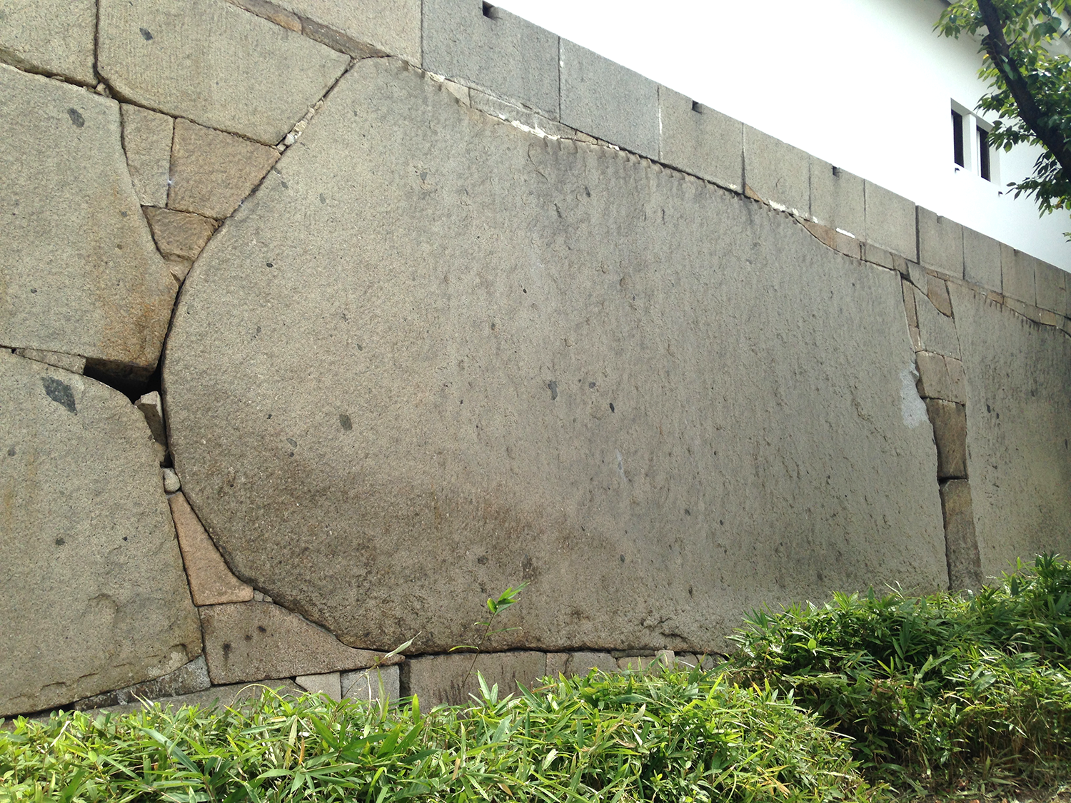 Ich zitiere aus einer Touristeninformation: "Die prachtvollen Wassergräben und die Steinmauern bestehen aus einer Vielzahl von riesigen Steinen und sind Symbole der soliden Verteidigung des von Tokugawa errichteten Osaka-Schlosses. Die Wassergräben sind 70 bis 90 Meter breit, und einige der Steinmauern, die auf beiden Seiten der Wassergräben stehen, sind mehr als 20 Meter hoch. Die Gesamtlänge der Steinmauern aus Granit beträgt 12 km, die Anzahl der Steine in den Wänden beläuft sich auf 500.000 bis 1.000.000 Steine. Die harmonische Schönheit der prächtigen Steinmauern und der Wassergräben überrascht und bewegt die Besucher." Kein Wort davon, woher diese riesigen Steine kamen – geschweige denn, wie sie dort zum Einsatz kamen.