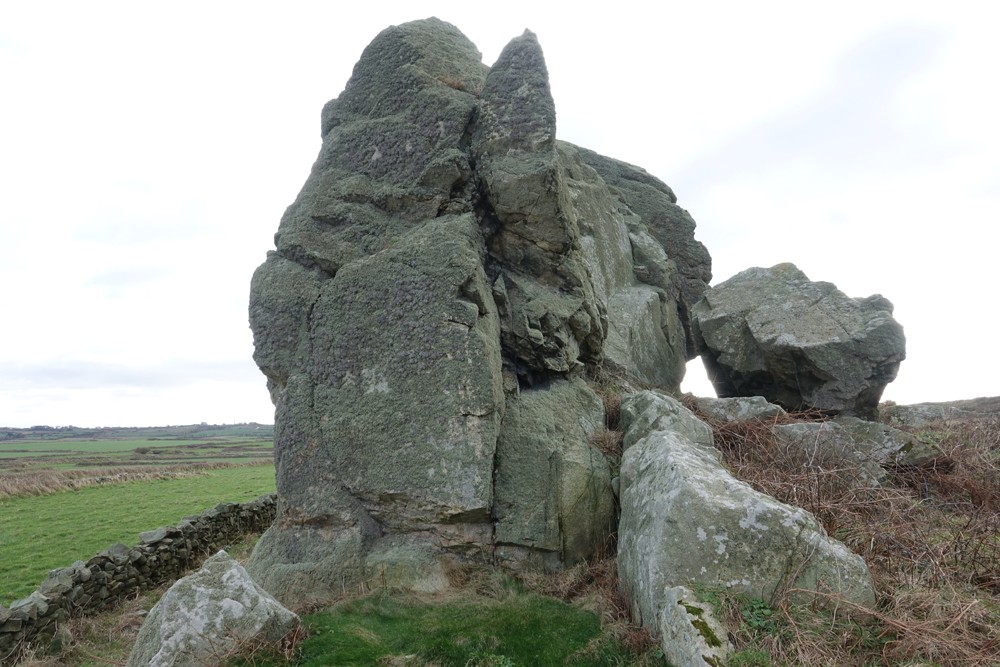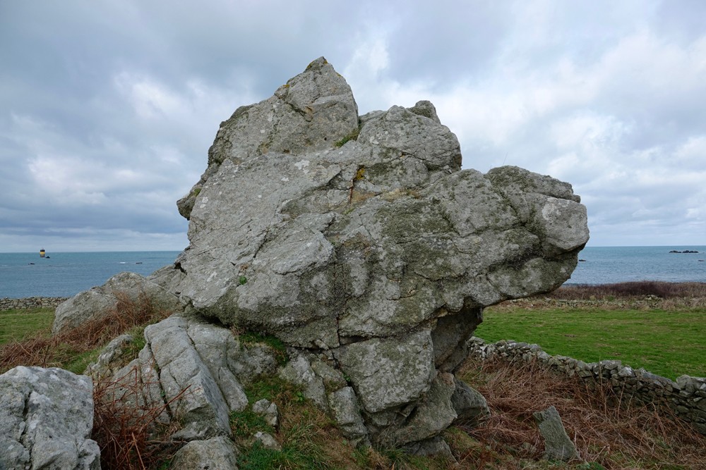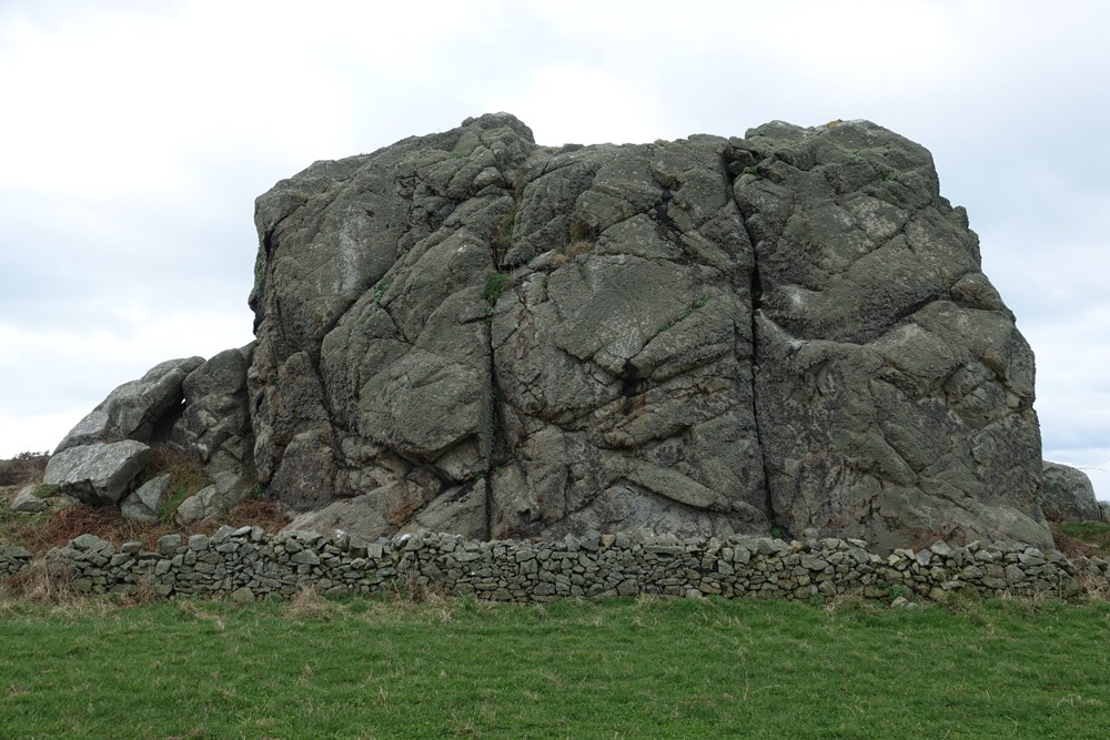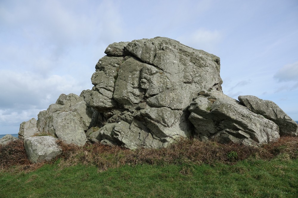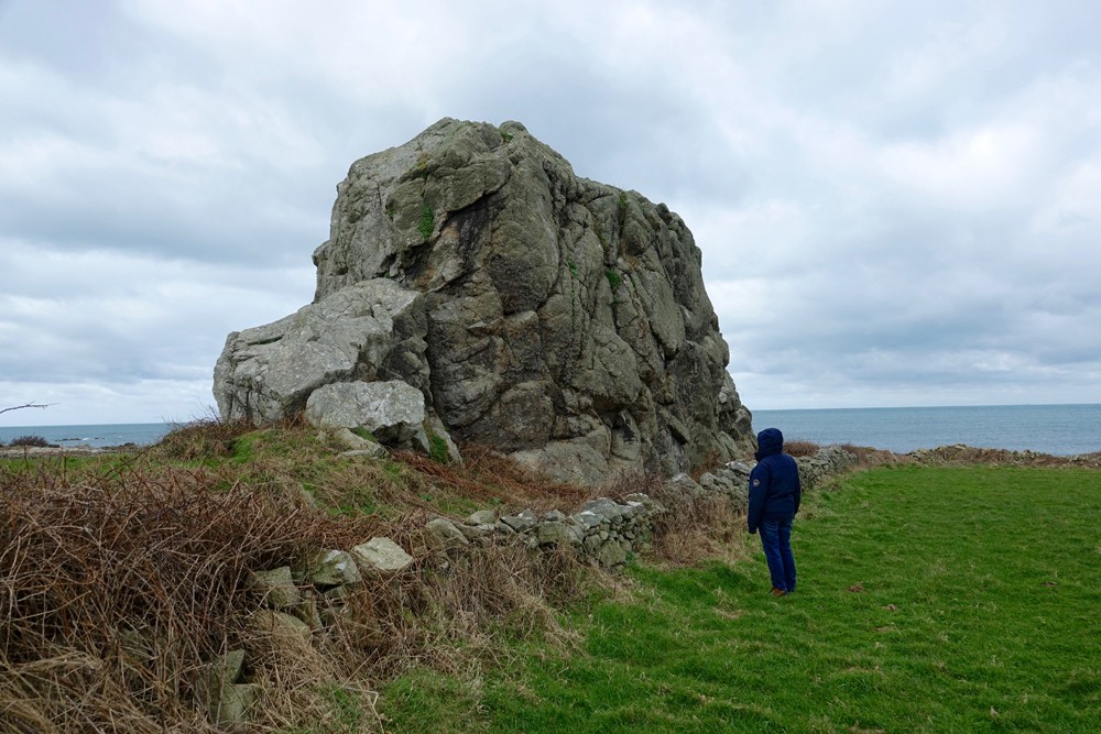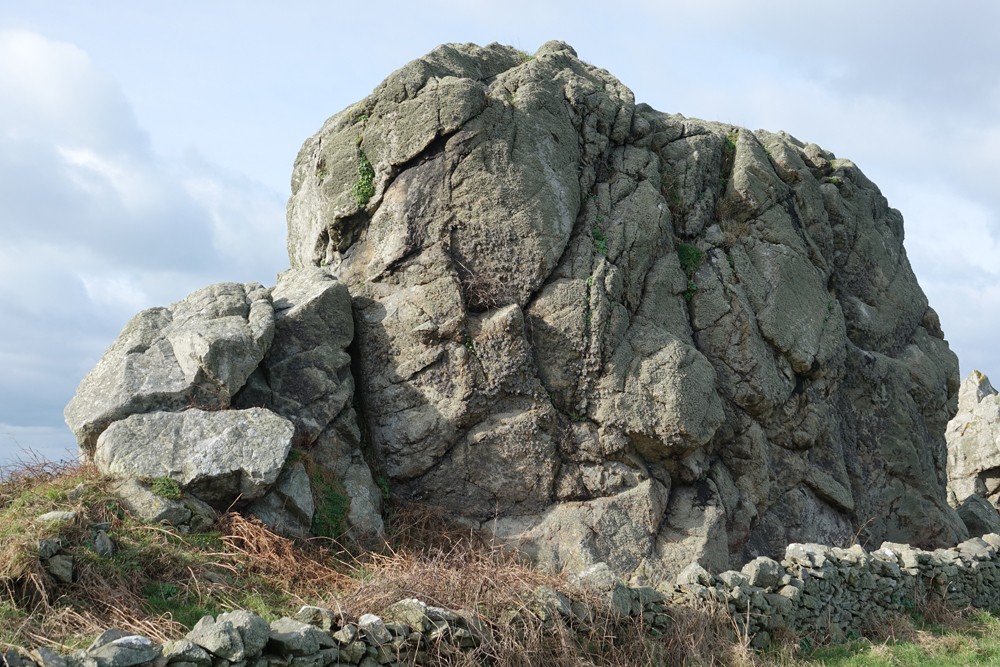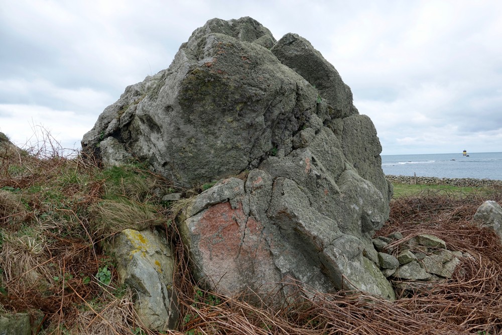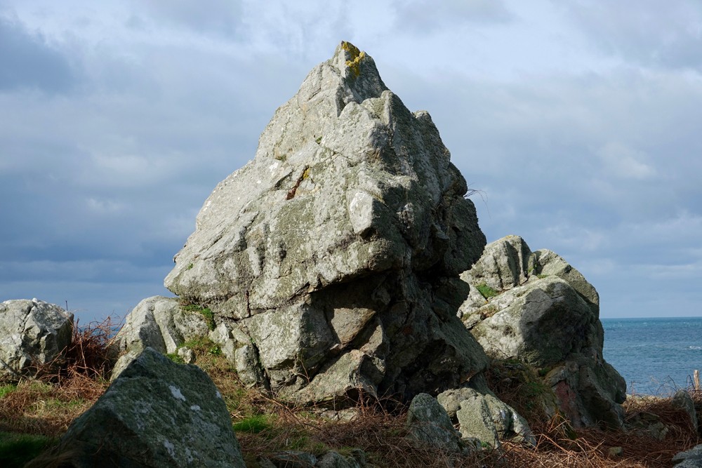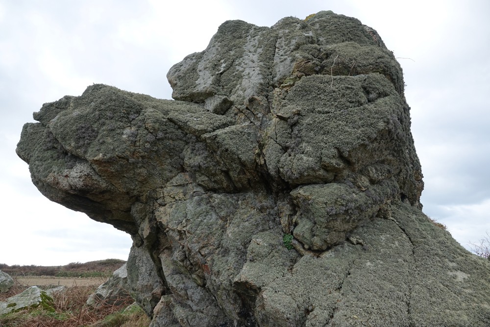Was sagen die Geologen? Man spricht von kryoklastischen (Kopf-)Ablagerungen, also zu deutsch: Ablagerungen, die durch eiszeitlich bedingtes Hangkriechen verursacht wurden. Der Felsen befindet sich also in einer kleinen Bucht, der sich aus einer tektonischen Graniststruktur gebildet hat und mit marinem Restmaterial und einer kryoklastischen Hangablagerung gefüllt ist.