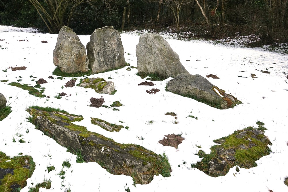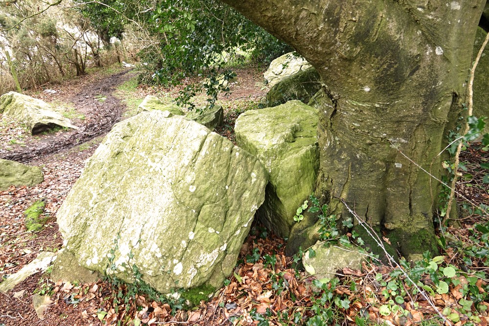 Wie eingangs erwähnt, befinden sich auf der Anhöhe wie übrigens auch in weiteren Wäldern in der Nähe mehrere Allées couvertes (Ganggräber, die ihre Bezeichnung nicht unbedingt verdienen). Diejenigen, die ich offenbar noch sehen konnte, wurden 1966 von einem Bernard Edeine „restauriert“ (das dürfte erfahrungsgemäß zu großen Verfälschungen des heutigen Bildes geführt haben). Ein „Gang“ besteht aus einer nach Osten und Westen ausgerichteten Kammern, die von einem Dutzend Blöcke in zwei parallelen Reihen flankiert wird. Allerdings fehlen die Deckenplatten. Drei Platten teilen den Eingang in zwei Teile. Zusätzlich wurde die Kammer durch flache, 40 bis 50 cm hohe Steintrennwände verschlossen, die an der Kante angebracht wurden. Der Raum war 8 m lang, 1,12 m hoch und 1 m breit und hatte eine grobe Pflasterung.