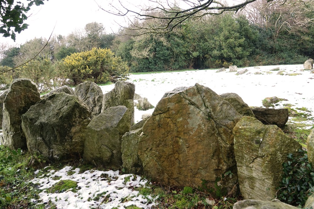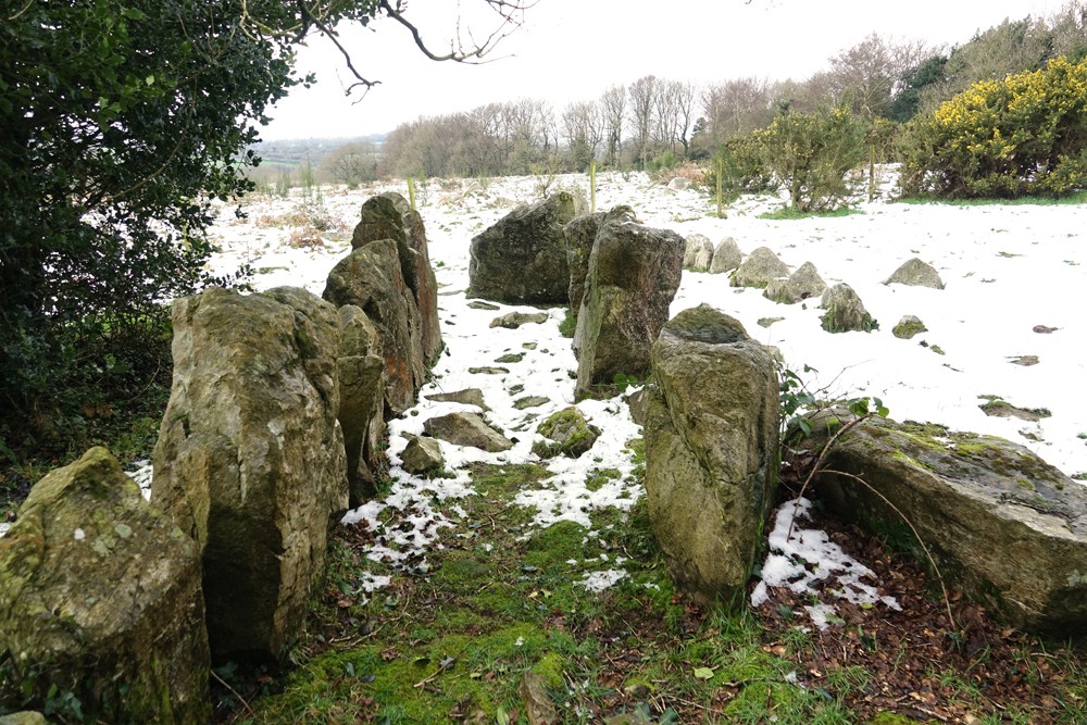 Der seinerzeit (heute nicht mehr) überdachte Gang war von einem Steinhaufen umgeben, der von kleinen, 30 bis 70 cm hohen Platten begrenzt war, die am Rand platziert waren. Dieser Verbund wurde – parallel zur Kammer auf der Nord- und Südseite – halbkreisförmig nach Westen ausgerichtet und verband den Eingang auf der Ostseite. Bei den Ausgrabungen wurden kleine Tonanhänger, Spuren von Holzkohle, sehr kleine Keramikscherben im galloromanischen Stil und sechs Feuersteinklingenfragmente entdeckt. Die Nutzung der Formation stammt lt. Mainstream-Wissenschaft aus der Jungsteinzeit (3.000 bis 2.500 v. Chr.). Nicht einer dieser Funde lässt auf eine Grabsituation schließen.