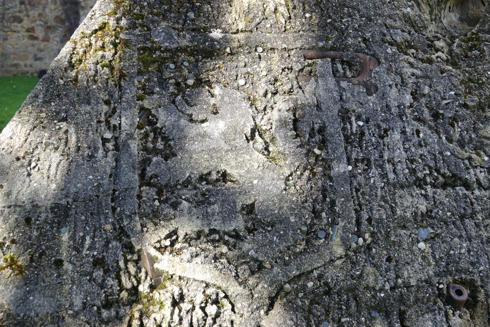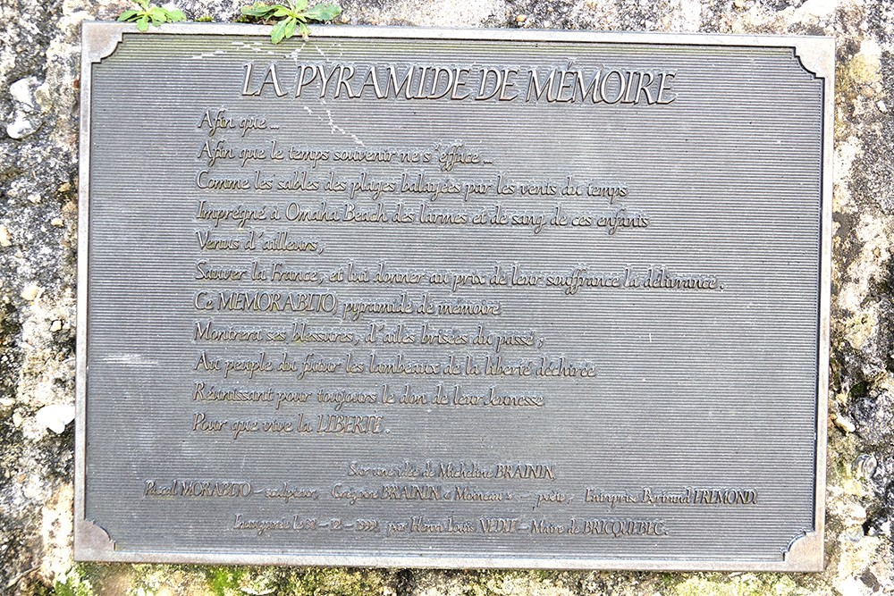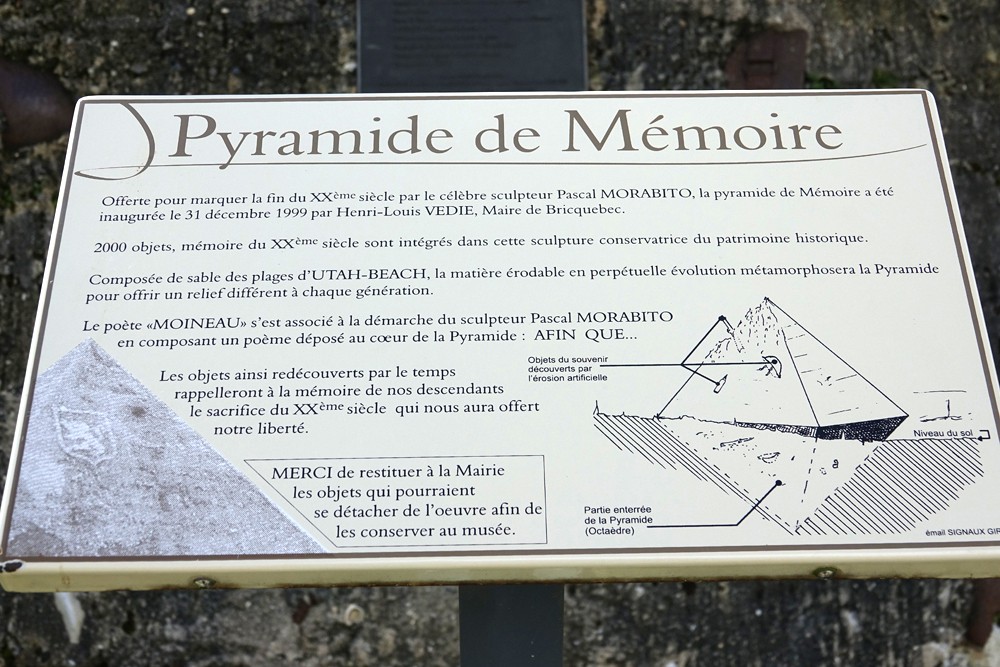 Inmitten der alten Schlossruine aus dem 10./11. Jahrhundert haben vermeintliche Philanthropen 1999 im Burghof eine Pyramide aus Beton gebastelt, die den Zweck eines Gedächtnissteins erfüllen soll. Die Pyramide ist mit Militärschrott der Invasionsschlacht (Juni 1944) befüllt worden und soll dort als Mahnmal gedeutet werden. Genau genommen sollen sich darin 2.000 Metallschrottbestandteile befinden, die auch an einigen Stellen des Betonrandes zutage treten. Man spricht hier von künstlicher Erosion, die den Schrott in Szene setzen soll.