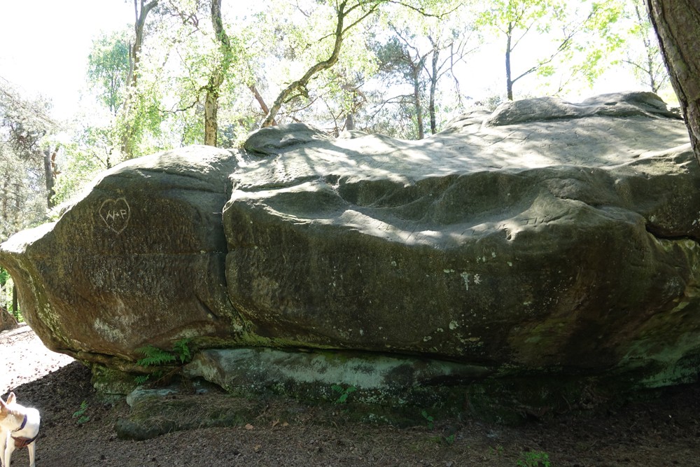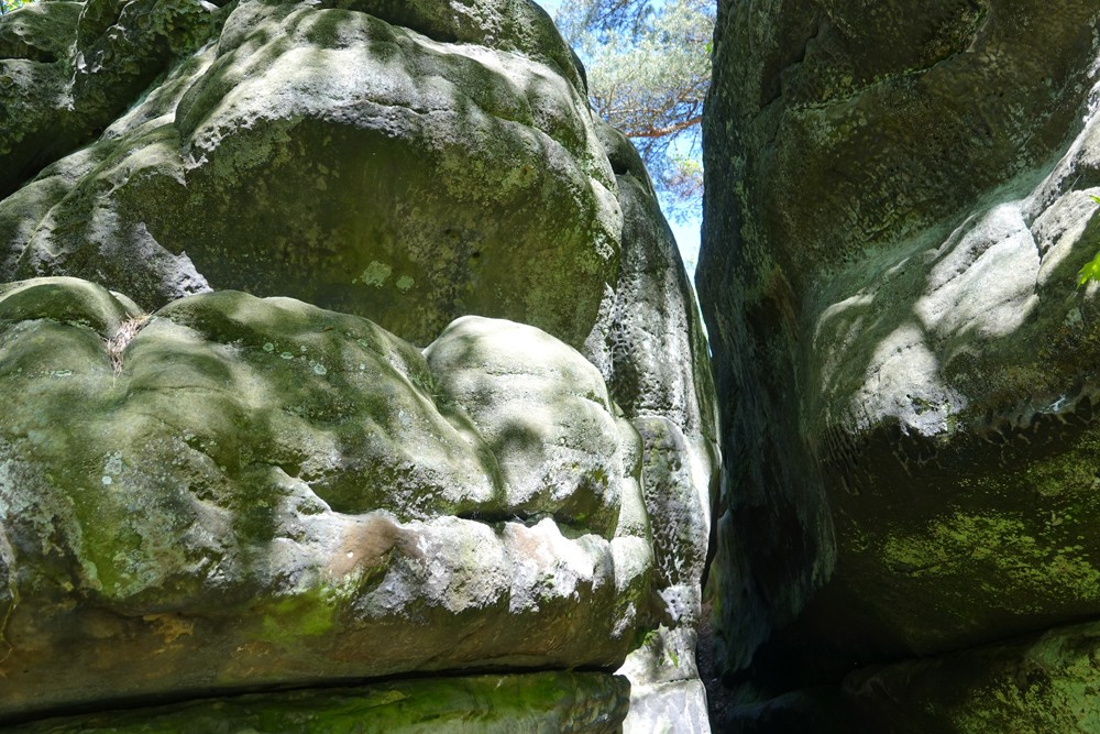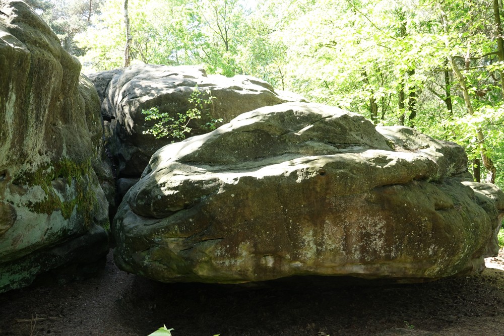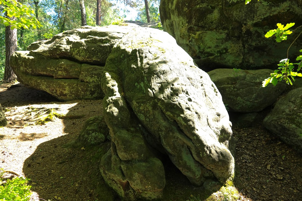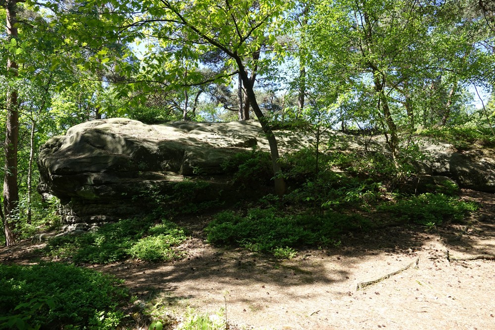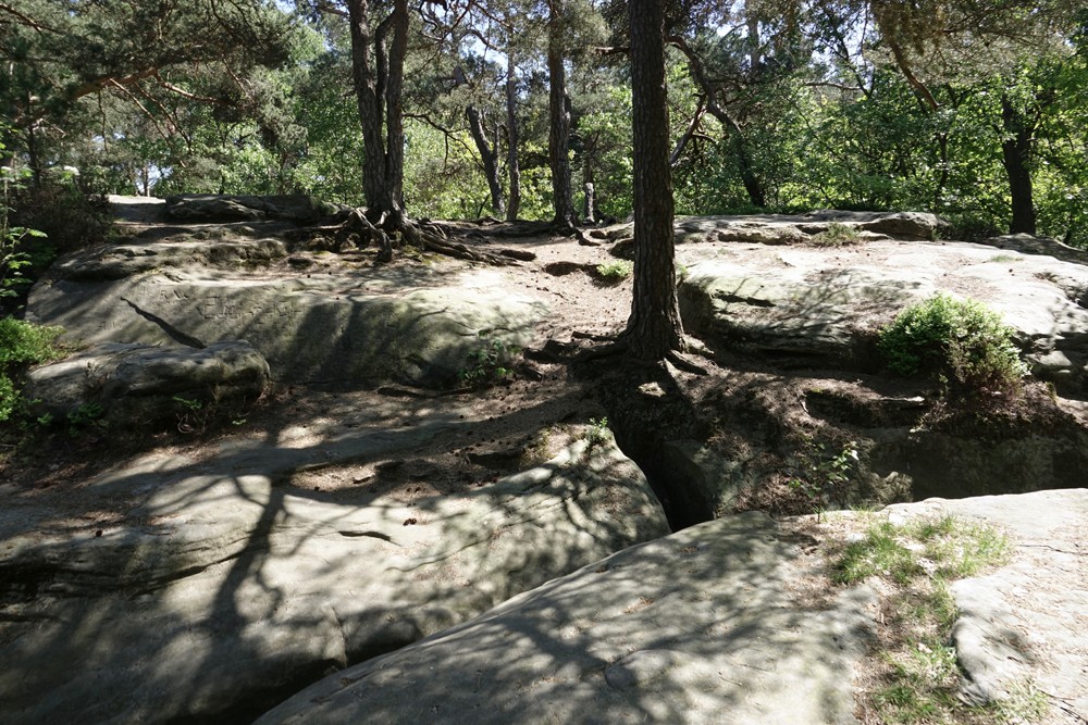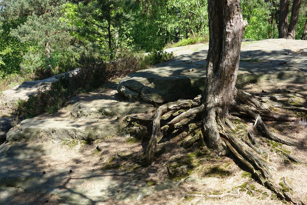 Ich stand vor einem doch recht großen Felsplateau, dass sich links und rechts bis zu 2,50 Metern Höhe erstreckte und praktisch einen Verbund aus aneinander stoßende Felsen bildete. Diese Formation aus Sandsteinfelsen wurde je nach Felsgruppierung „Sloopsteen“, „Teufelsfelsen“ oder„Siebenschläfer“ genannt. Dass es hier mal wieder zu kirchlichen Namensentgleisungen kommen würde, war mir vorher schon klar. Kurzerhand kletterte ich auf das Plateau und war überrascht darüber, auf „nacktem“ Sandstein doch etliche Kiefern zu entdecken, die mit minimalistischer Ausbeute dort ihr Dasein fristen.