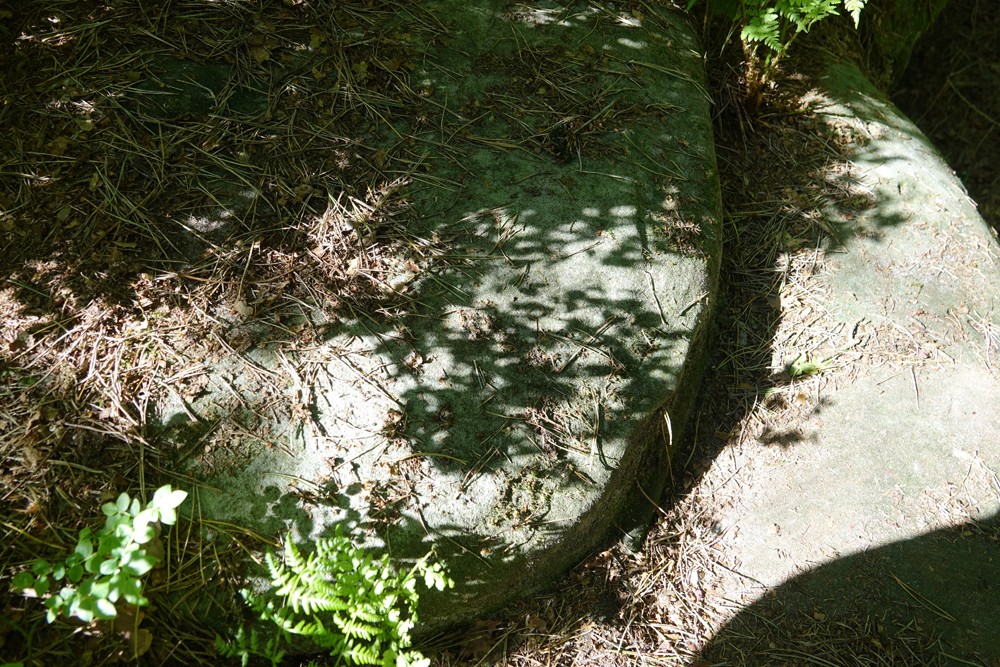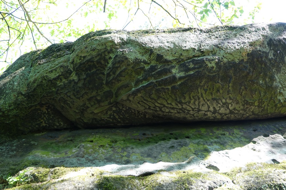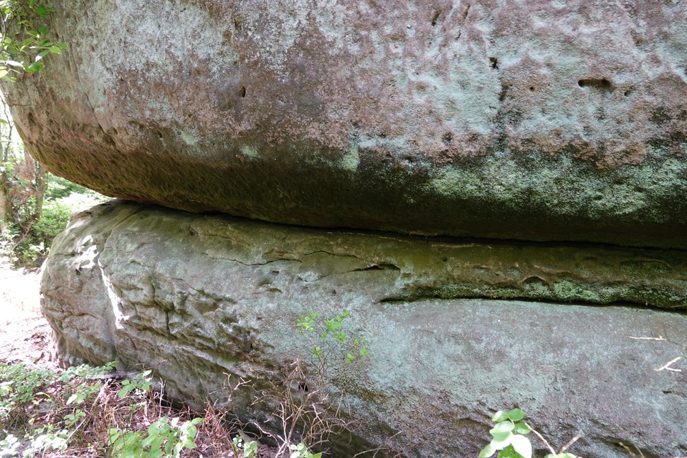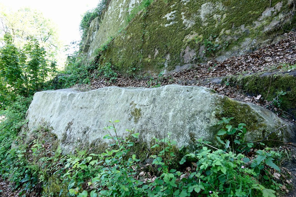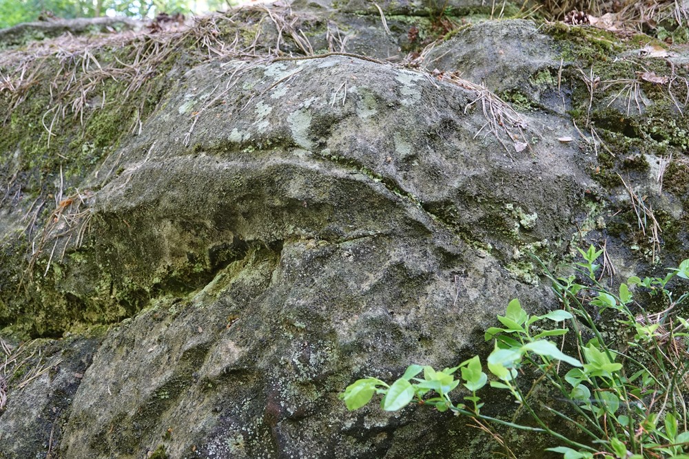 Auffällig fand ich 4 nahezu parallel laufende Wulste, die nach unten bzw. oben wiesen. Der Felsen sieht am Aufgang so aus, als wäre er mit den Jahrtausenden über drei parallel verlaufende Schneisen ausgetreten oder über schweres Gerät zugänglich gemacht worden.