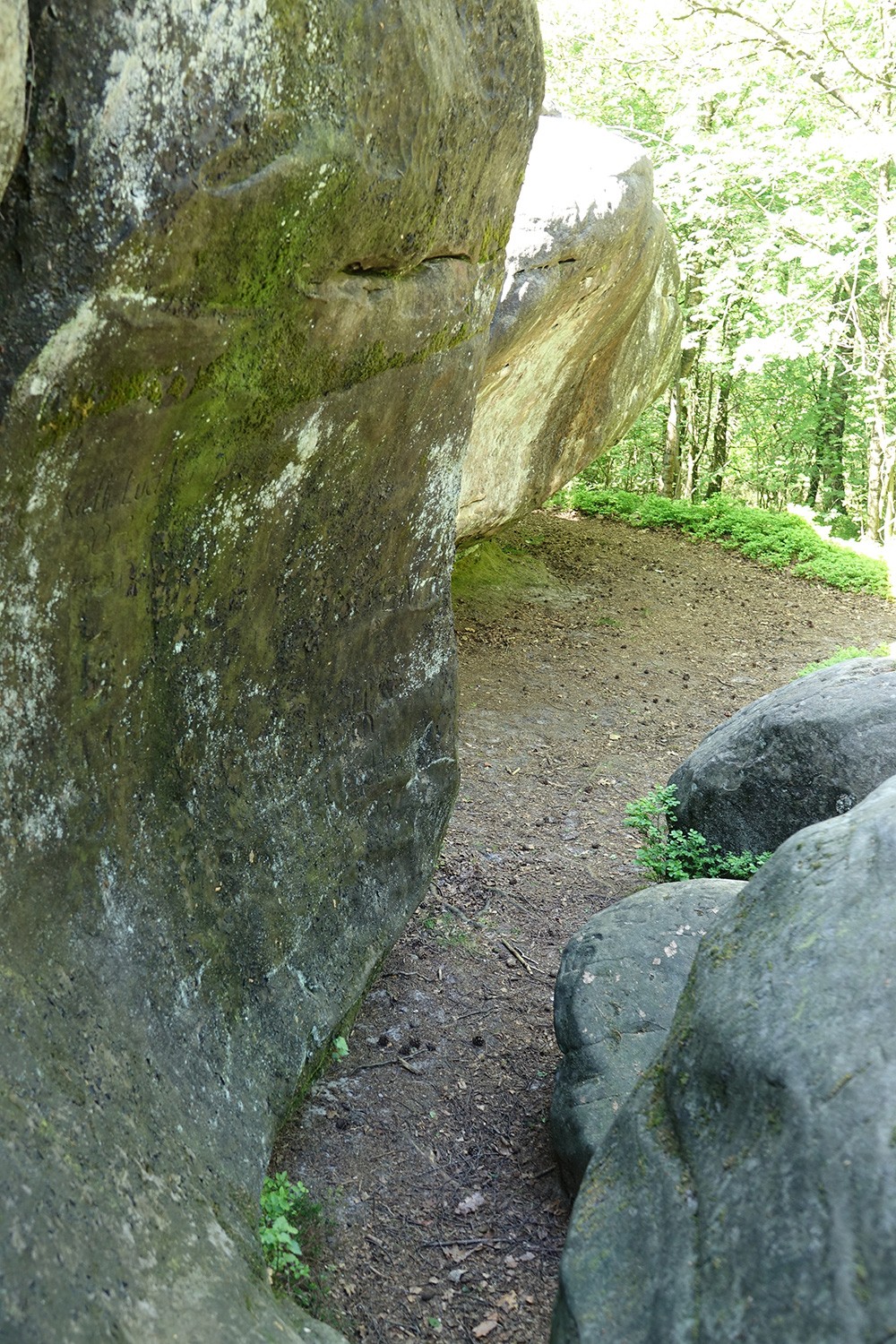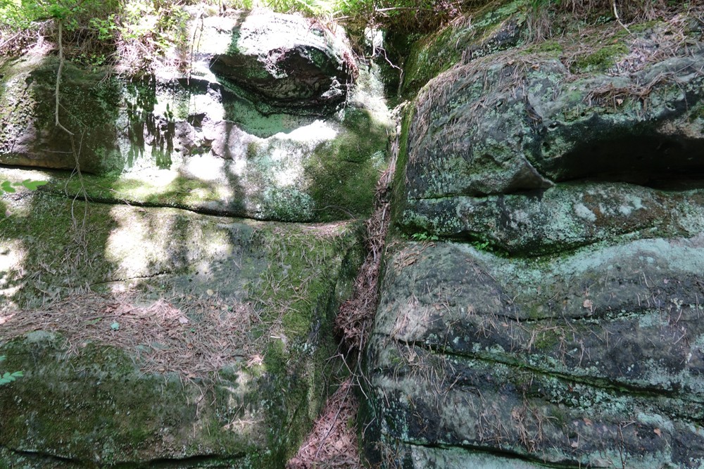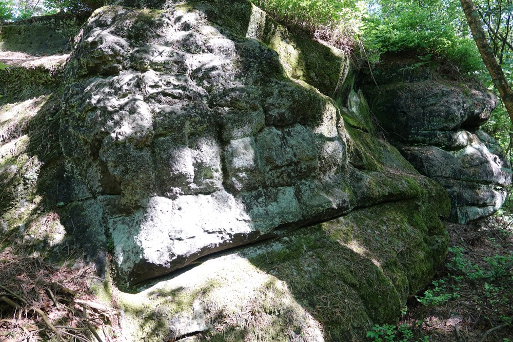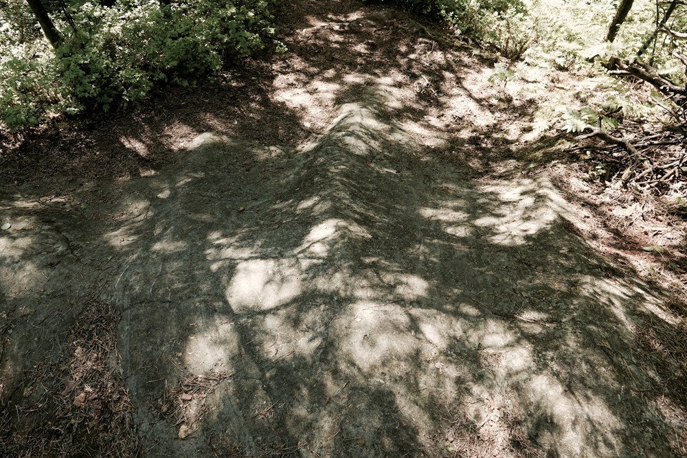 Auffällig fand ich 4 nahezu parallel laufende Wulste, die nach unten bzw. oben wiesen. Der Felsen sieht am Aufgang so aus, als wäre er mit den Jahrtausenden über drei parallel verlaufende Schneisen ausgetreten oder über schweres Gerät zugänglich gemacht worden.