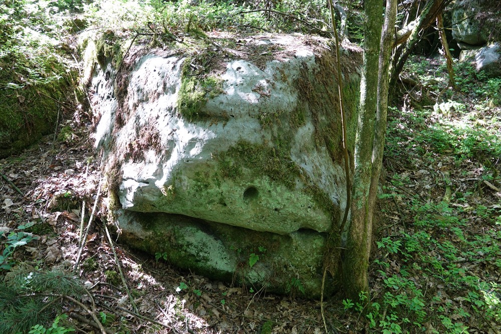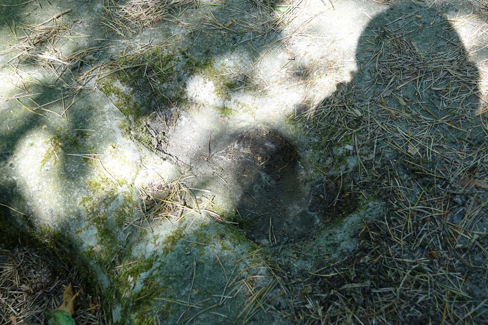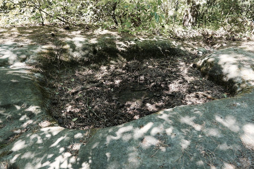 Es handelte, wie ich schnell herausfand, um einen Felsen, der möglicherweise (oder wahrscheinlich?) zu Opferzwecken genutzt wurde. Der Felsen lässt sich leicht zugänglich besteigen und man stolpert praktisch auf zwei Metern Höhe unmittelbar über eine „Opferwanne“, die dort „ausgeschnitten“ ist. Die nahezu rechteckige Ausführung mit Abflussrinne ist für jeden Besucher unübersehbar. Weitere grobe furchenartige Bearbeitungsspuren des Felsens befinden sich unmittelbar (links) am Beckenrand.
