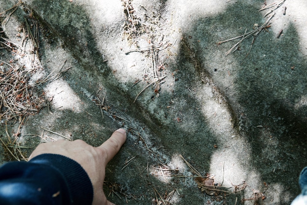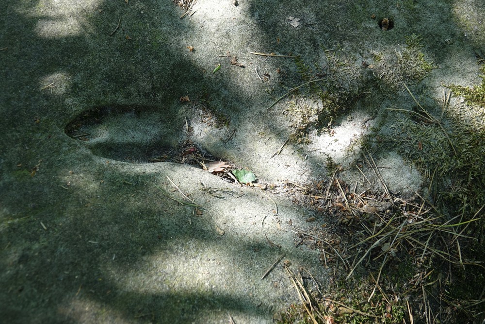 Soll hier wirklich der Wurm drin gewesen sein? Manche Spuren sehen menschengemacht aus. Man findet dort Abdrücke, die zumindest so aussehen, als wären sie mit Gewicht in eine ursprünglich weiche Masse eingebracht worden, wie von Schuhen.