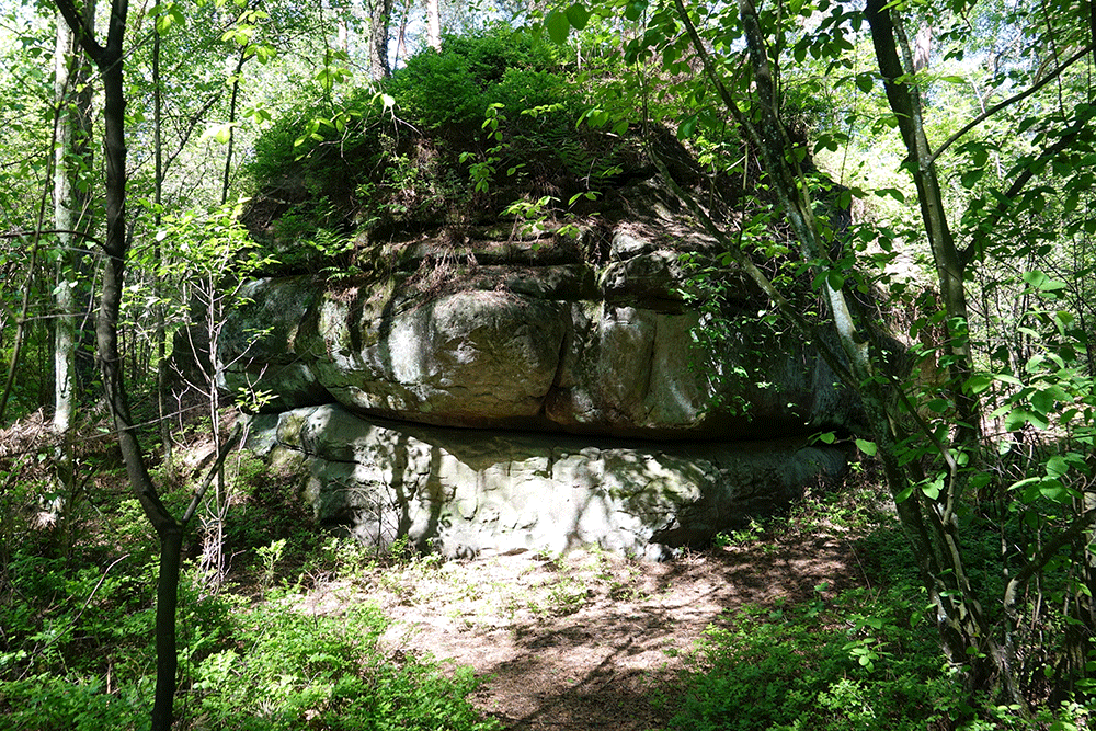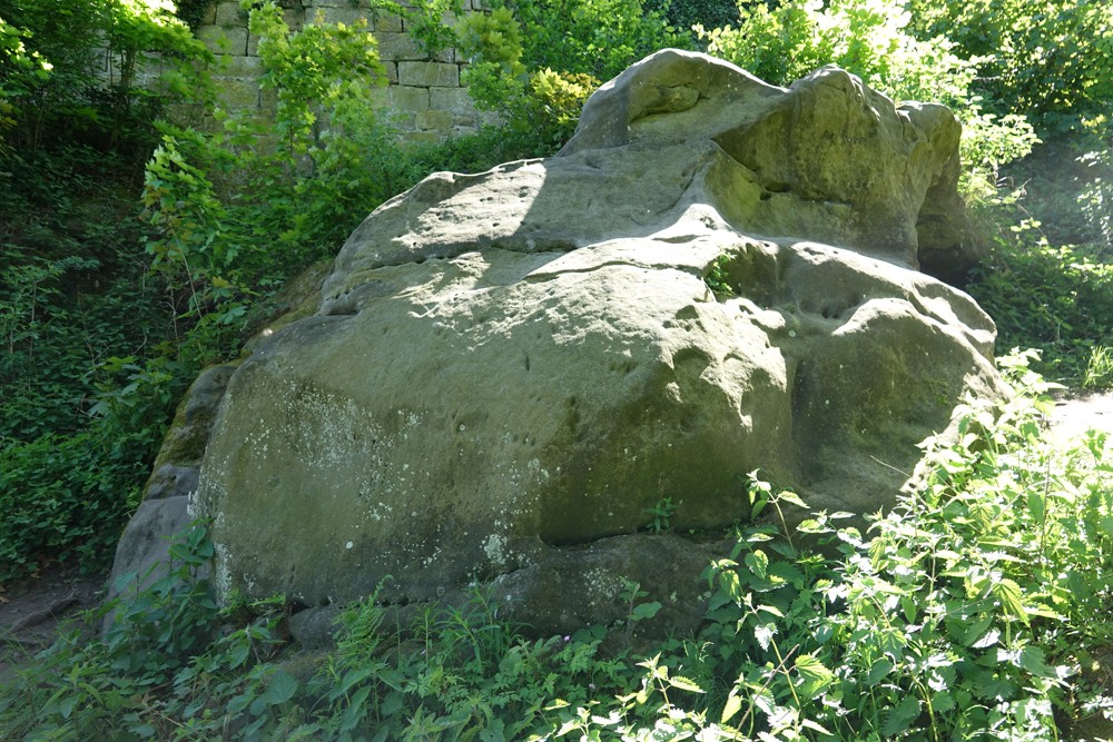 Dem unterstützenden Mauerwerk vorgelagert befinden sich Sandsteinfelsen mit zum Teil figürlichen Formen. Hier ist auch sehr ansehnlich ge- bzw. bearbeitet worden.