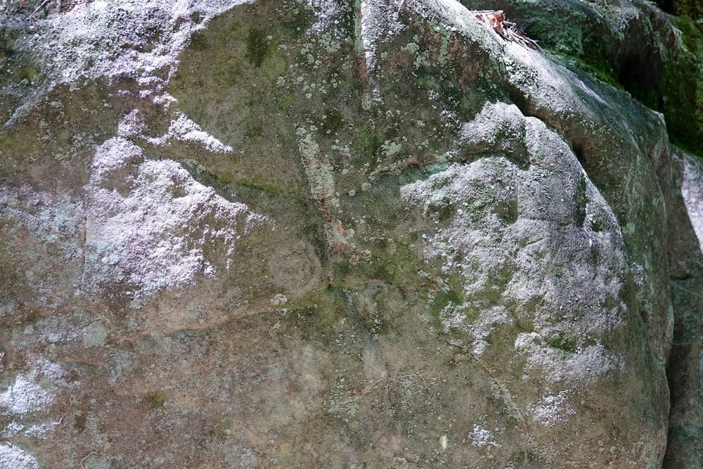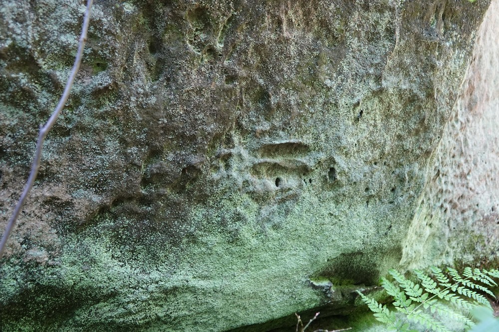 Hier der von Karl Heinz Wend herausgelesene Echsenkopf, der an einer Ecke des Teufelsfelsens "herausgehauen und einskupltiert" worden sein soll (Zitat Autor Gert Meier). Es war purer Zufall, dass ich von der Seite auch eine Aufnahme getätigt habe. Es soll sich hier um den Hauptkopf handeln, wenngleich auch andere Felsen als Gesichtersteine "geoutet" wurden (wie sicherlich auch meine Echsengestalt).