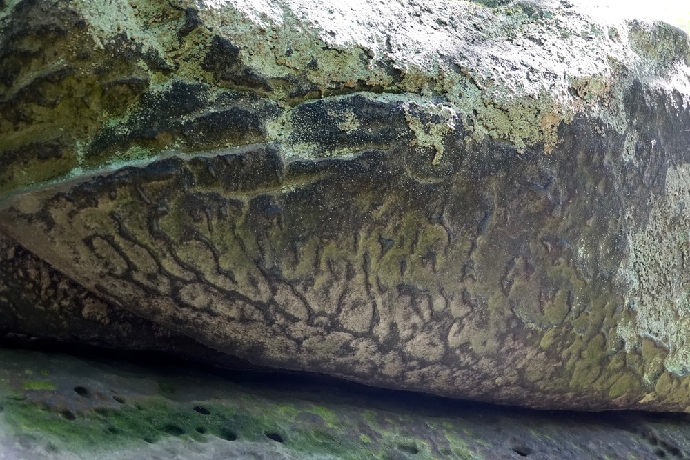 Wurmabdrücke, häufig sogar reliefartig, lassen sich ja in der Regel zweifelsfrei nachweisen – schon aufgrund ihrer Form. In diesen Fällen hier muss man schon recht abstrakt um die Ecke denken, um diese Erkenntnisse damit in Beziehung zu bringen. Ich will damit nicht sagen, dass so etwas an dieser Stelle nicht vorkommt, aber die auffälligen Felsspuren sind dann wohl eher anderen Ursprungs. Ich würde sie dann schon eher in Bezug setzen zu menschlichen Aktivitäten. Natürlich bin ich kein Paläontologe und kann mich auch irren. Aber einen Großteil der besonders auffälligen Spuren, die teilweise sogar symmetrisch erscheinen, würde ich hier keinesfalls einem Wurm zuordnen. Dann würde ich mich schon eher wieder der wilden Spekulation einer nicht unbegründeten Erosionstheorie anschließen.
