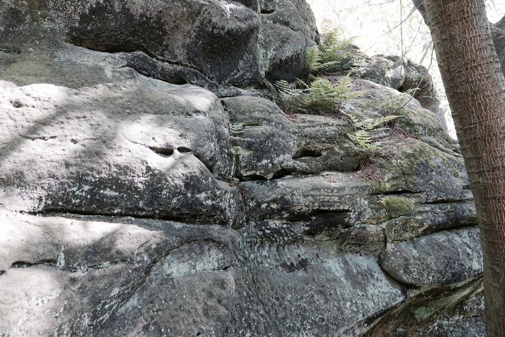Folgt man dem Pfad weiter, trifft man über einen kleinen Abzweig den nächsten Felsen, der wie ein Hamburger „geschichtet“ ist. Man hat nicht den Eindruck, dass eine der Schichten morphologisch mit der anderen etwas zu schaffen hat. Vertikale Erosionsspuren sind bei Sandsteinformationen vermutlich gut nachvollziehbar, doch die vertikalen Schichten, die sich in Form, Stärke und Ausrichtung so stark voneinander unterscheiden, geben mir ein wenig zu denken. Die dichte Bepflanzung oben drauf hat mich davon abgeschreckt, den Gipfel zu besteigen. Erinnerte mich ein wenig an Landschaften in Avatar – Aufbruch nach Pandora.