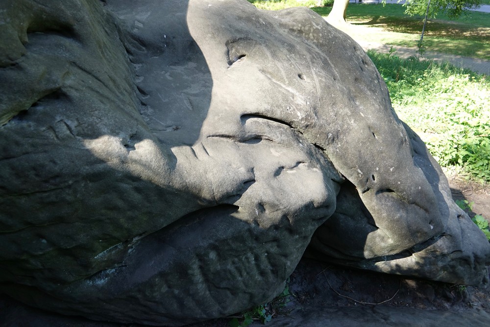 Weitaus markanter finde ich diesen folgenden Gesichterstein, der mir auch gleich ins Auge sprang. Jedenfalls dürften hier die Spuren der Verarbeitung ebenso unübersichtlich sein wie das Ziel, eine Skulptur zu erschaffen. Diese hat selbstverständlich über die Jahrtausende hinweg ein wenig gelitten.