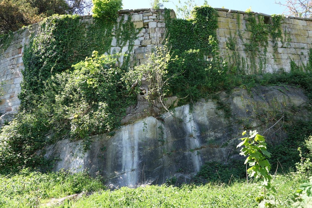 Fels und Bauwerk stoßen aufeinander. Die ursprünglichen Felswände sehr recht bearbeitet aus.
